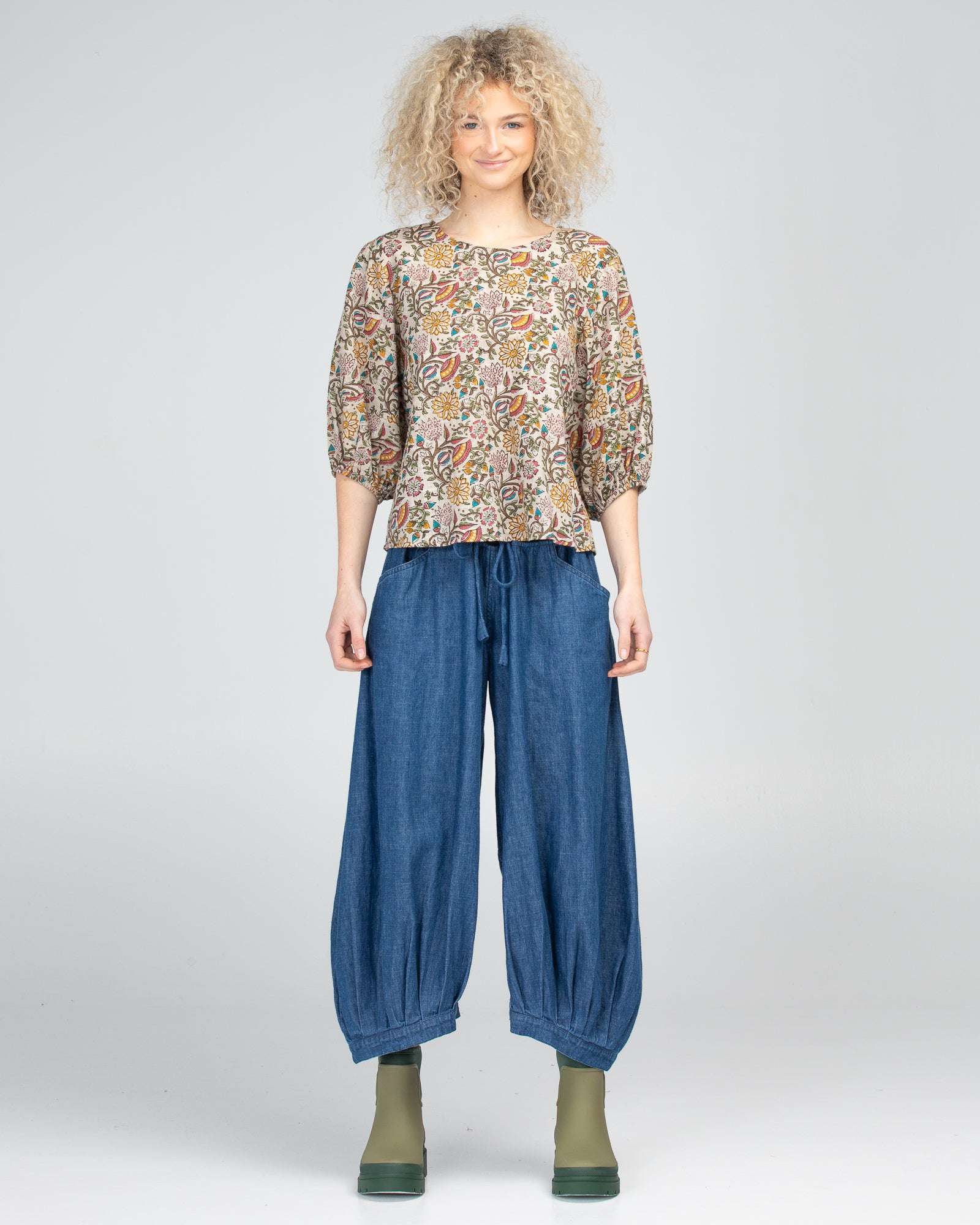 Our bestselling Guru Pant is now in a mid wash denim! This style is fitted at the waist with a relaxed, balloon-style leg, perfect for everyday wear. These 100% cotton bestsellers can be worn with just about anything.