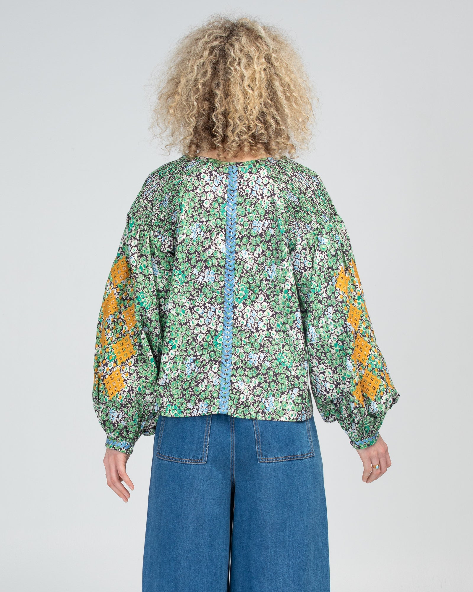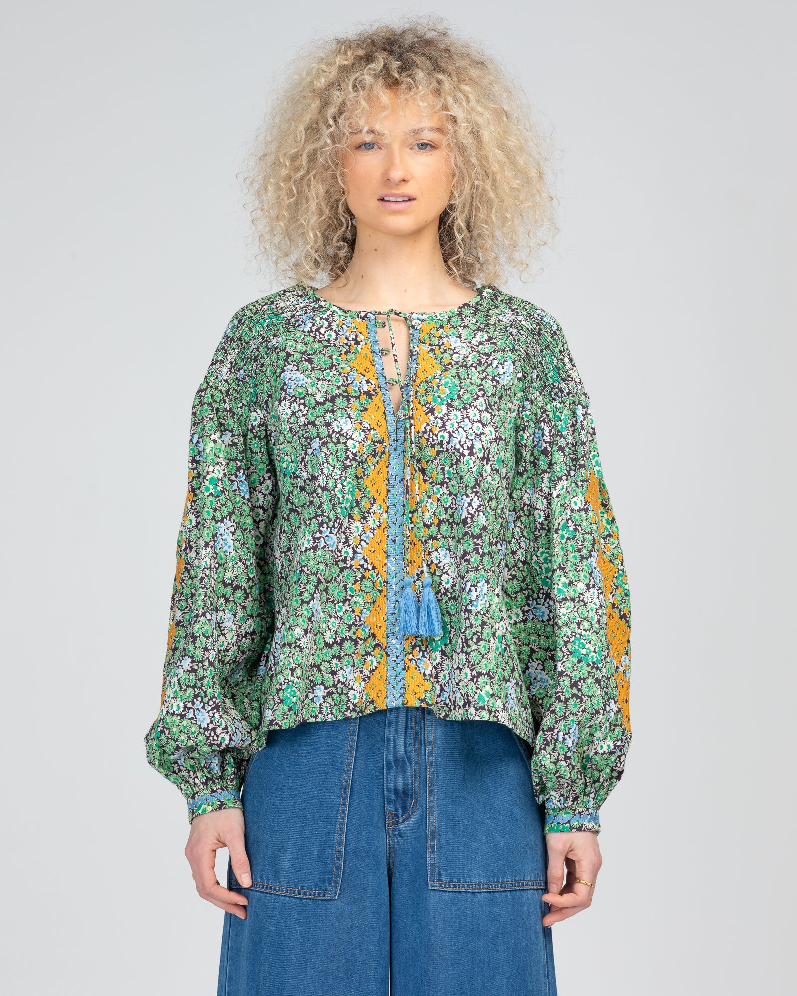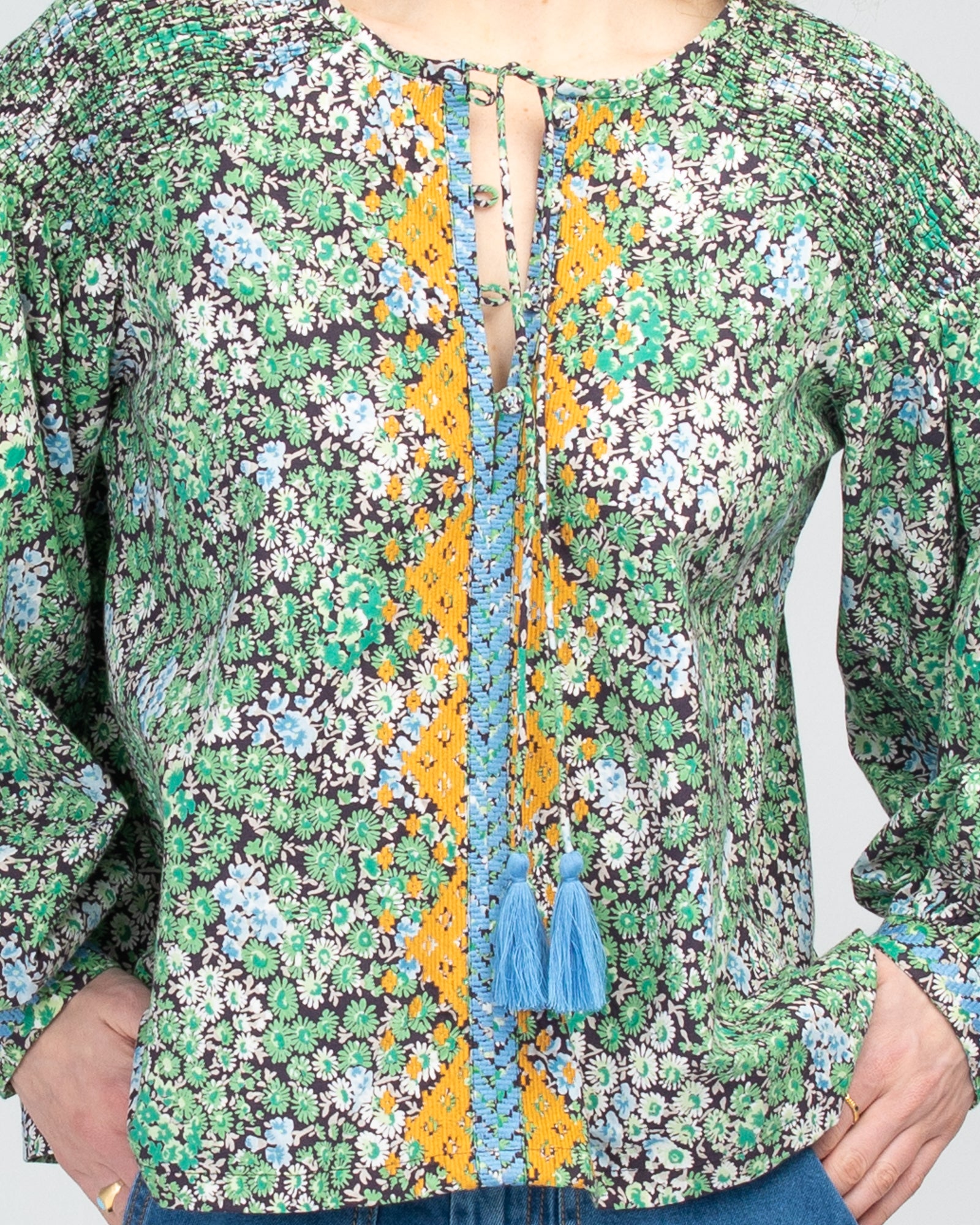 100% cotton, shirred shoulder panels, gathered oversized sleeves, neck ties with tassels and long sleeves.