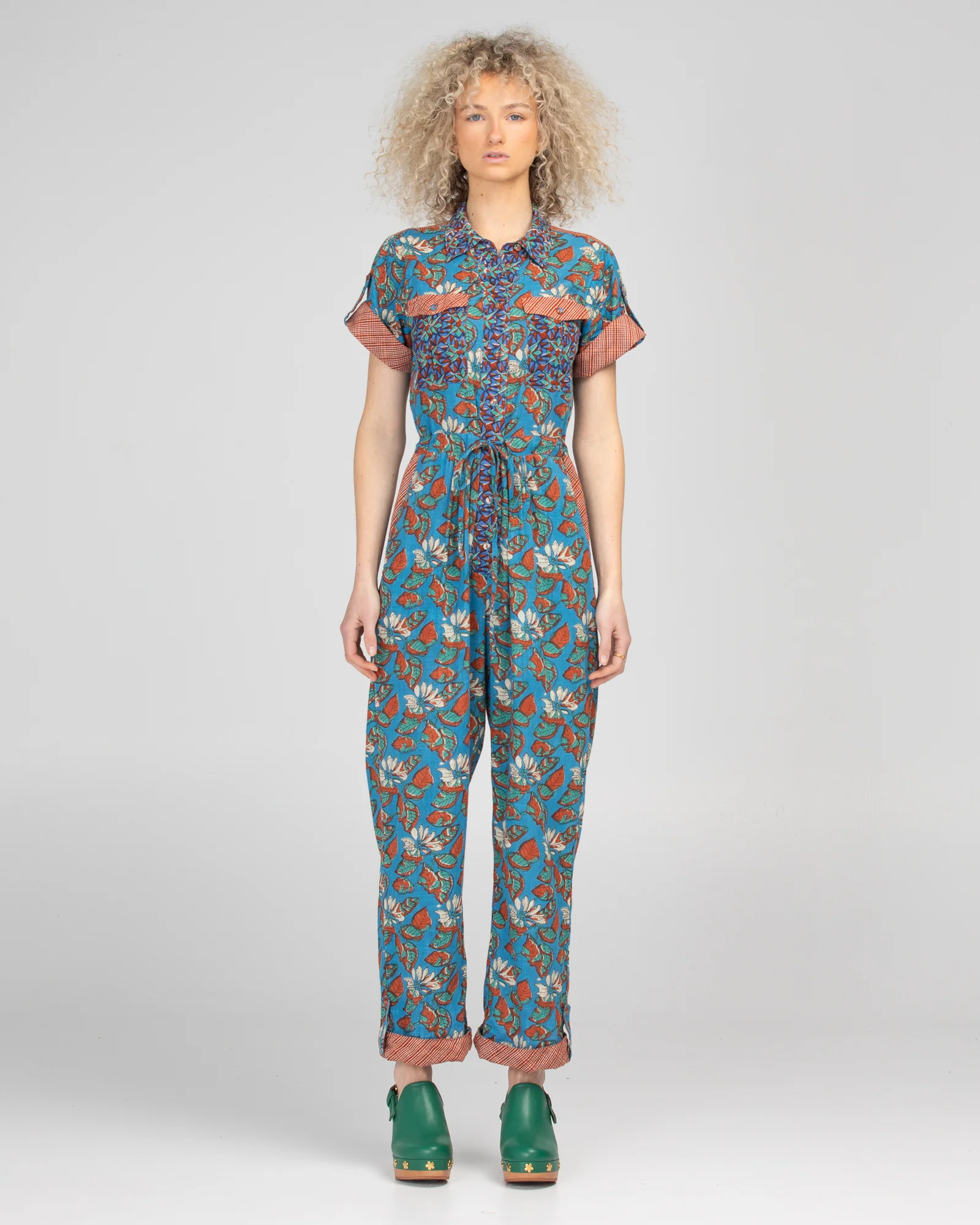 100% cotton, drawstring waist, front pockets, collar, spliced panels in contrast prints, front placket with buttons, sleeve tab with button and wide folded hem panel cuff with button tab.