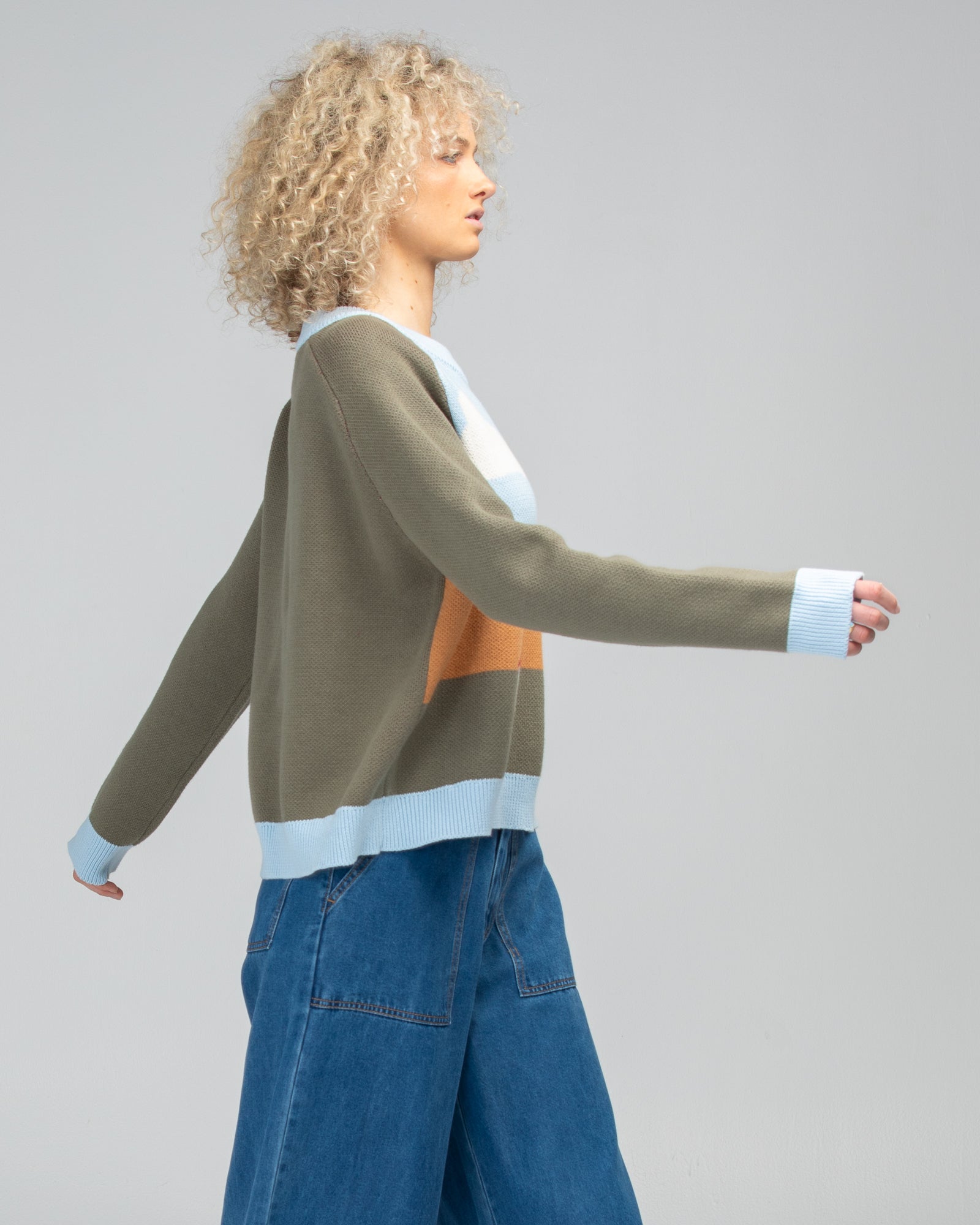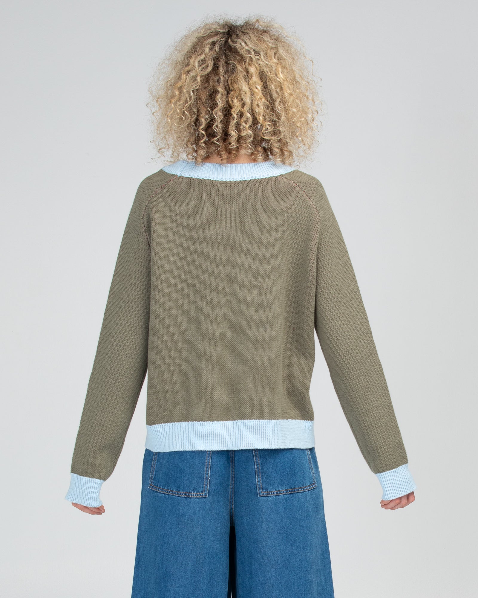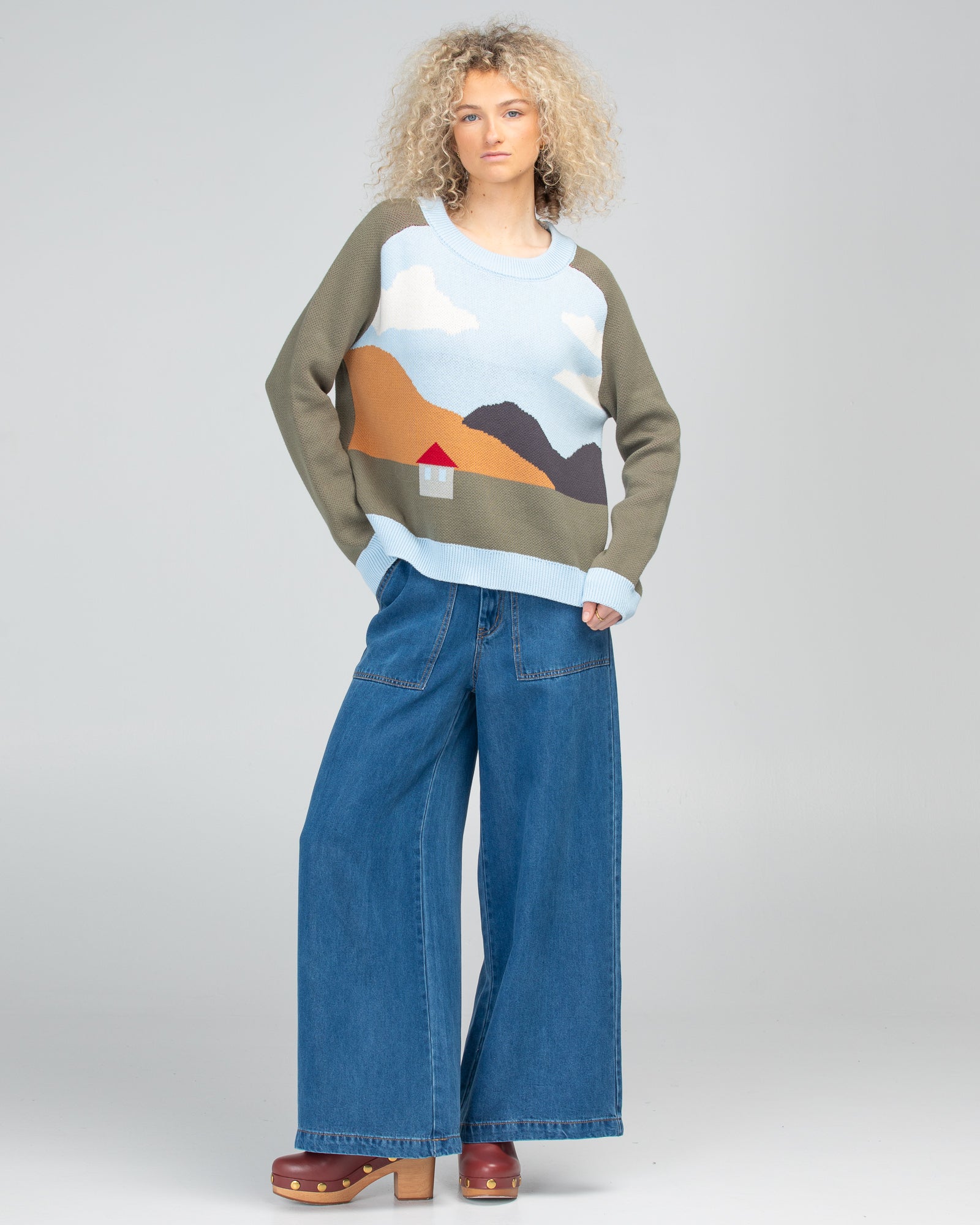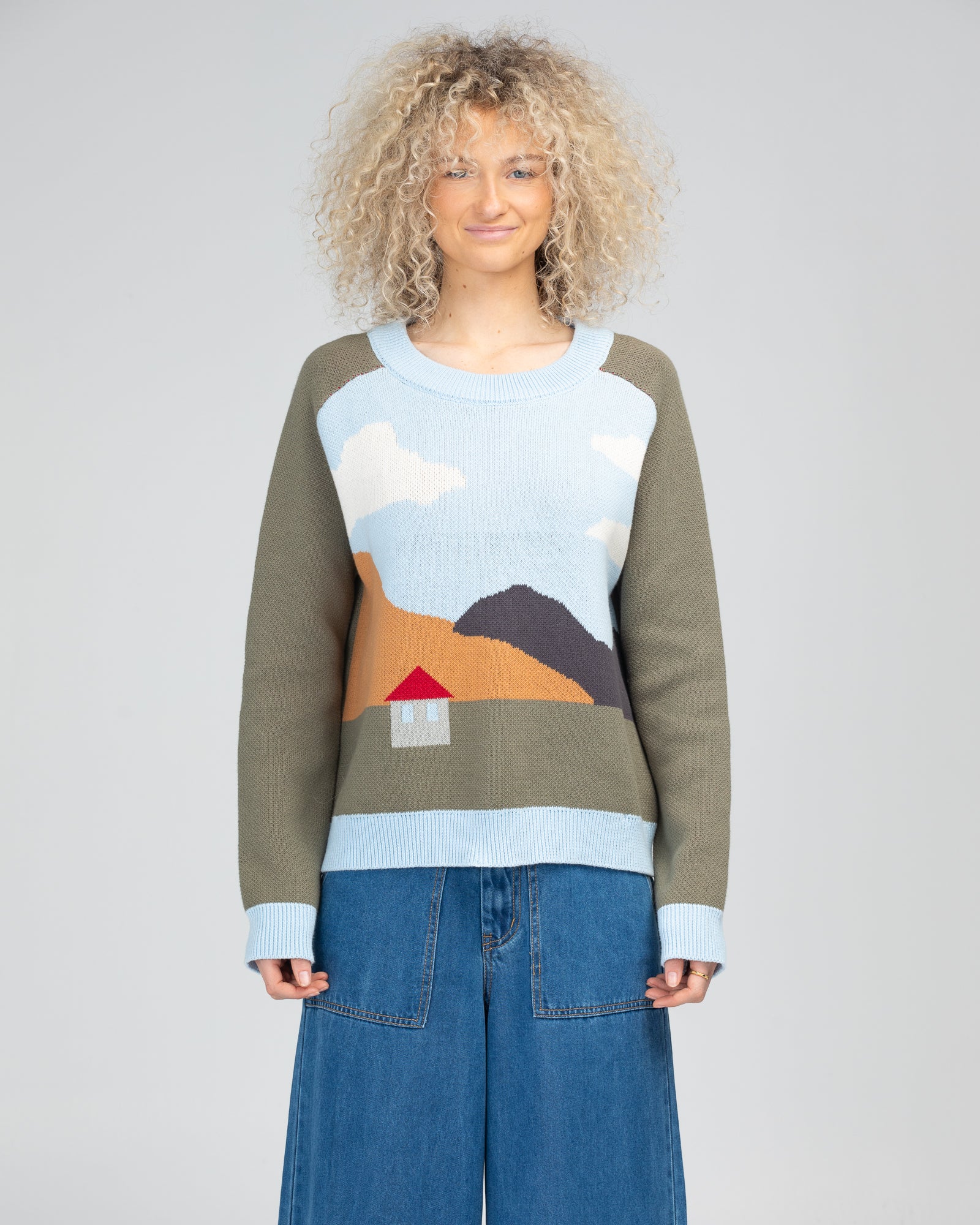 100% cotton, round neckline, house jacquard scene, relaxed fit, ribbed neckline, hems and cuffs, contrast khaki sleeves and back.
