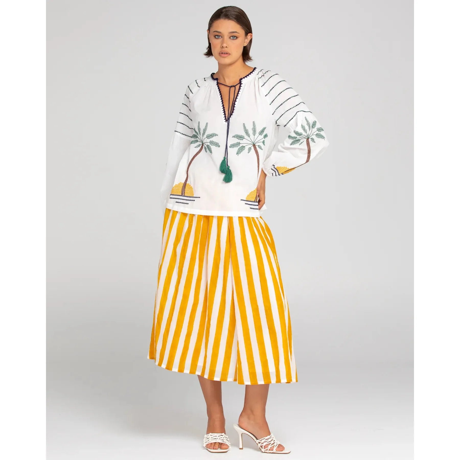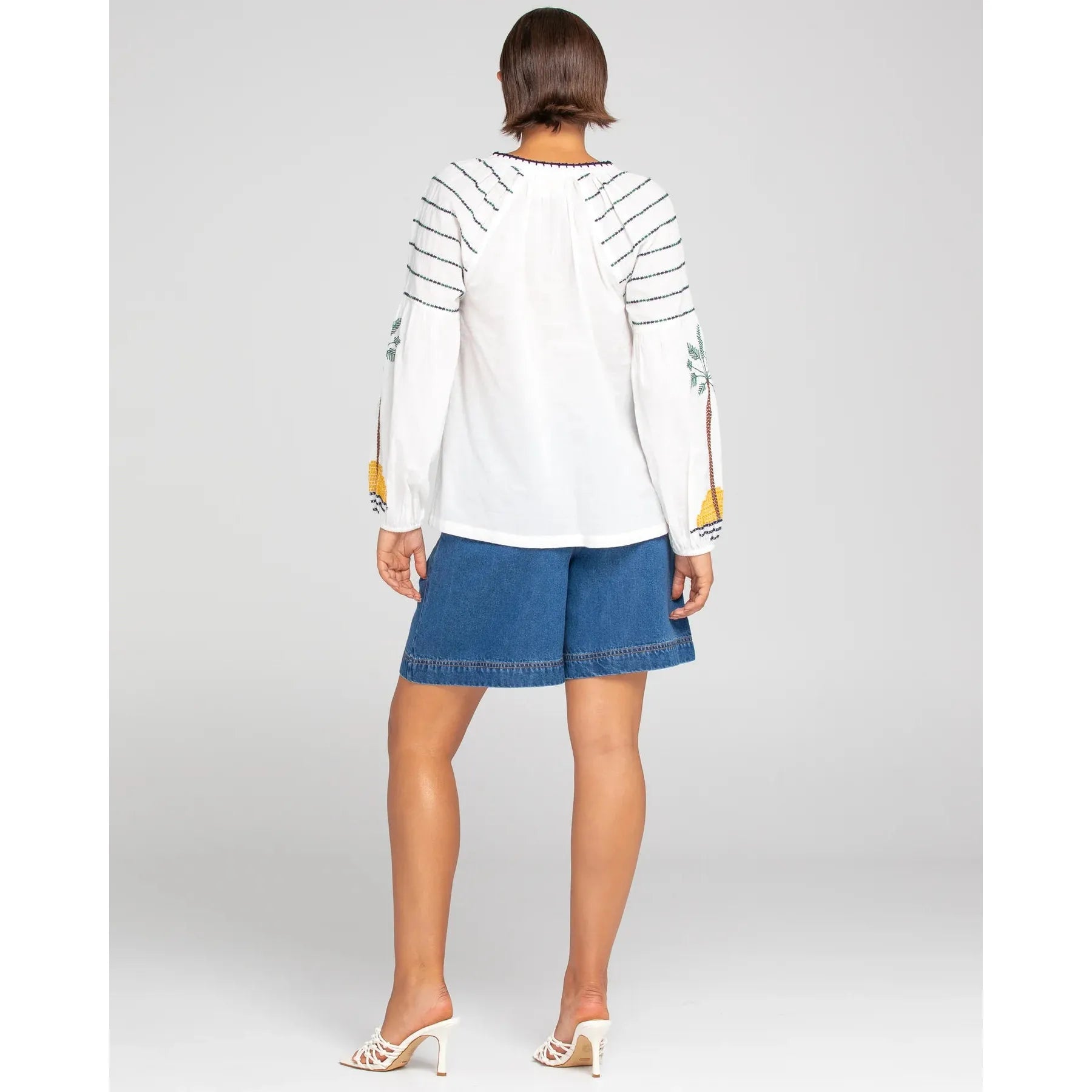 The Boom Shankar Palm Shirt is a statement piece adorned with intricate embroidery, gathers galore and billowing sleeves. A beautiful addition to any wardrobe and a treasure to adore for years to come.