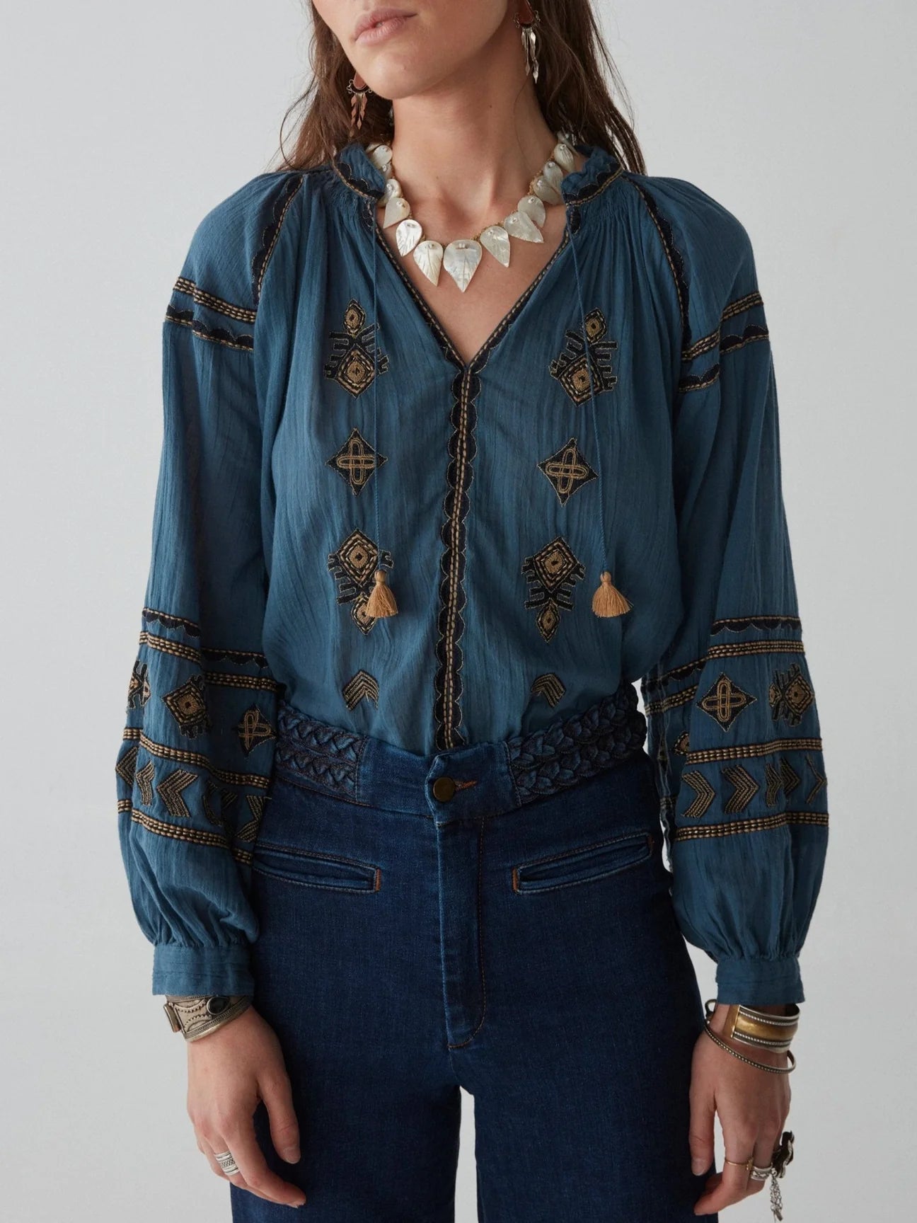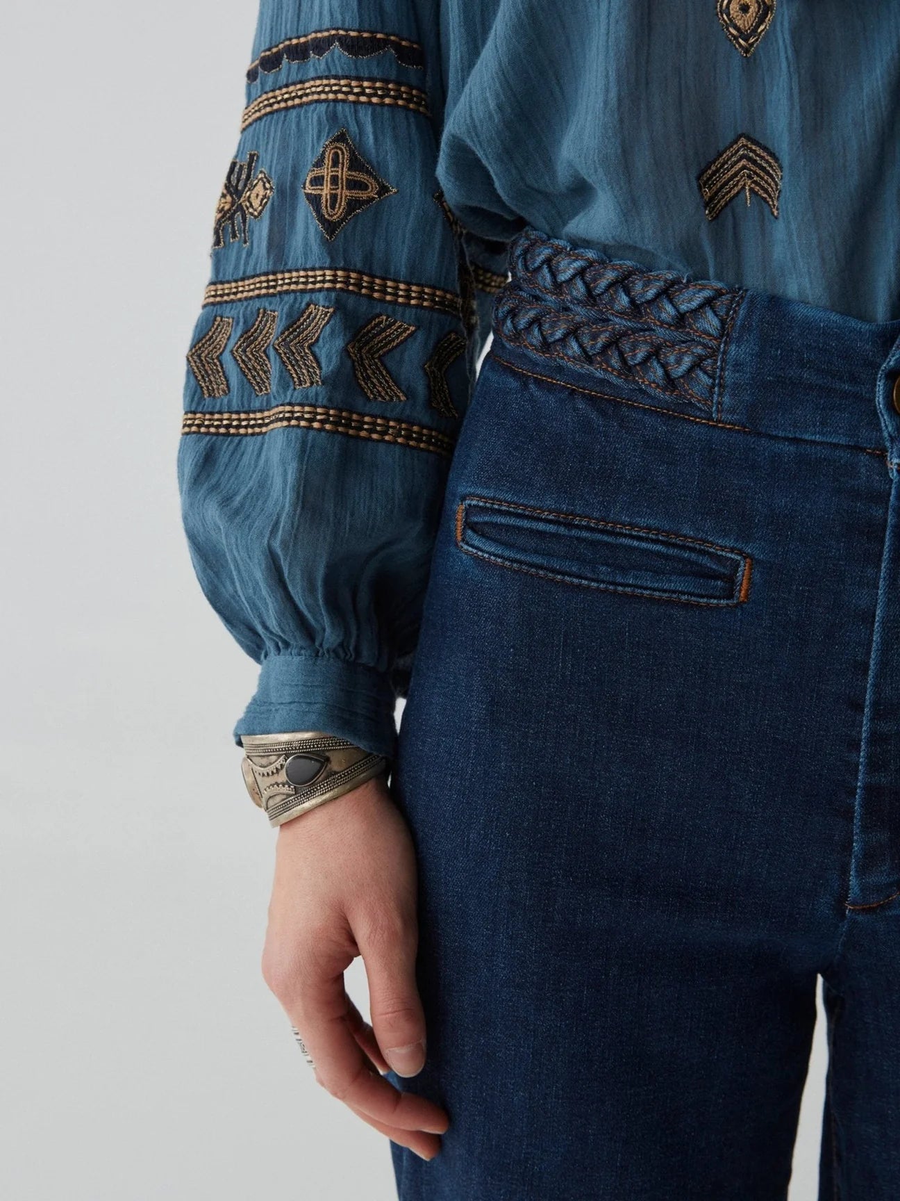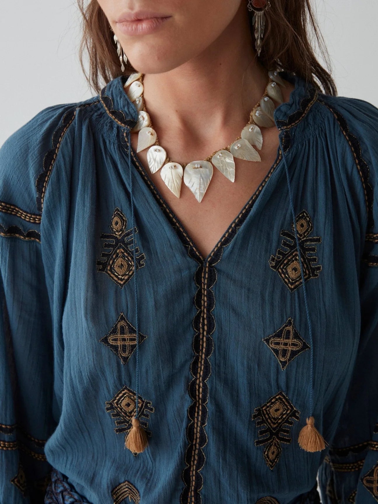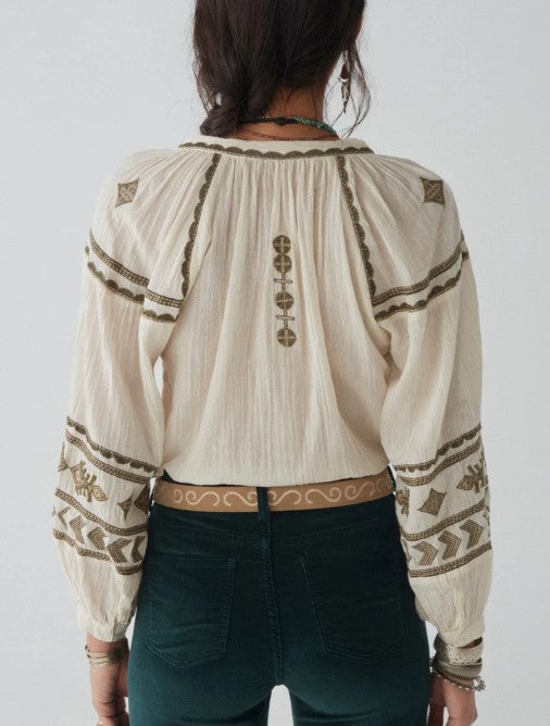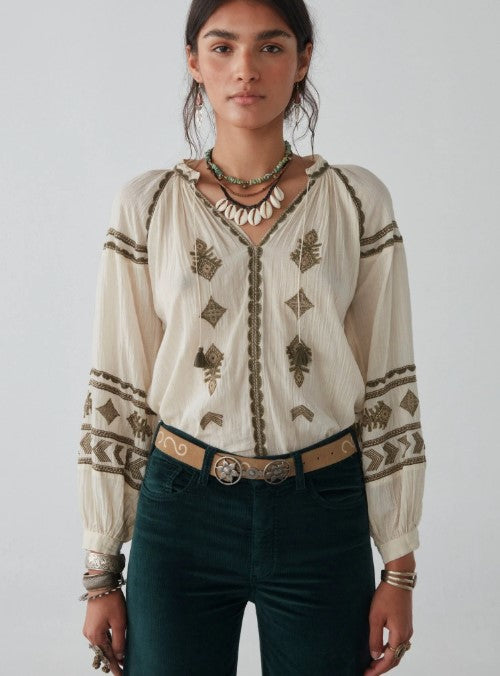 The Celo Finito Blouse isn’t here to play it safe. Cut with finest flowing cotton, this blouse grabs attention with its vivid olive-toned embroidery that wraps around the sleeves and cascades down the front.