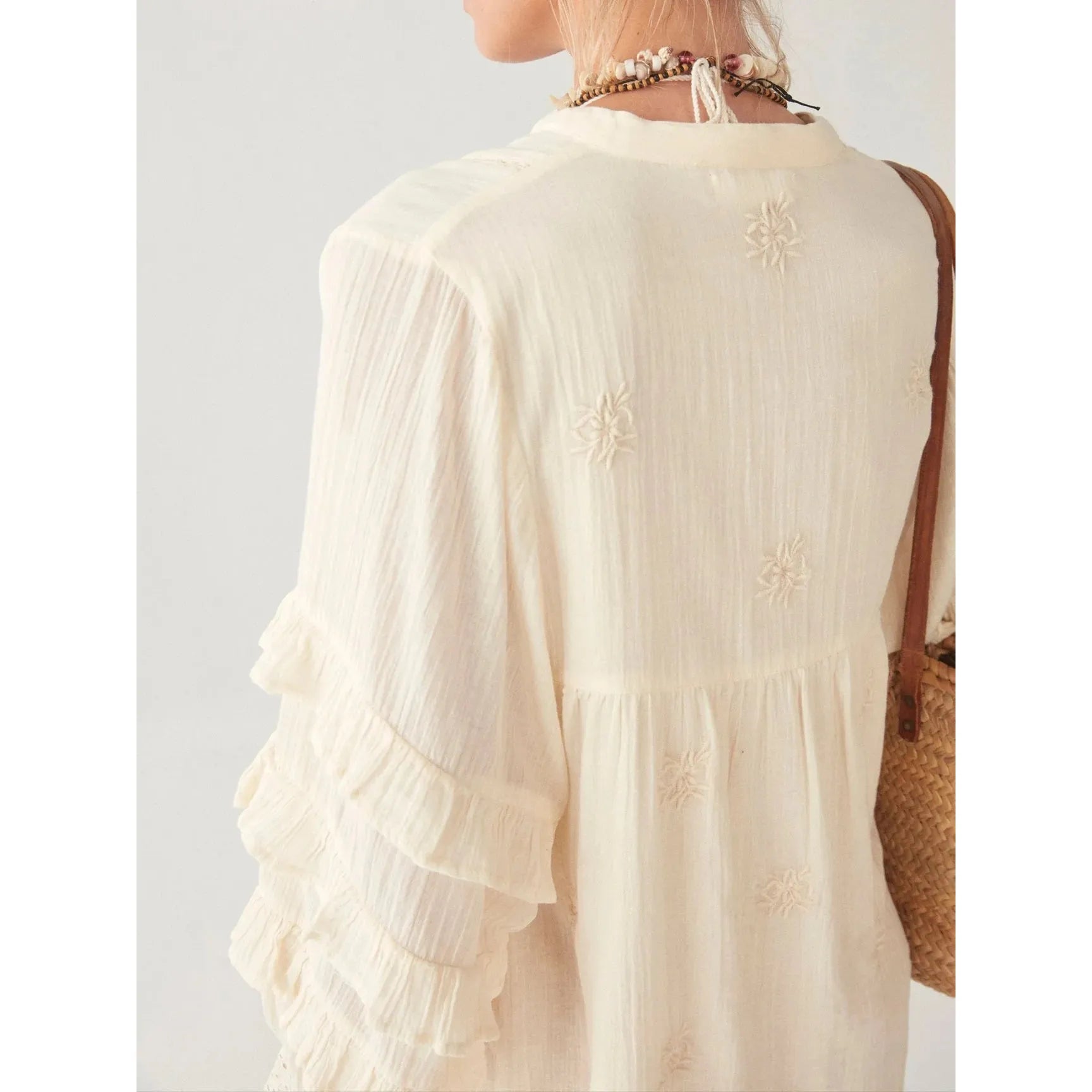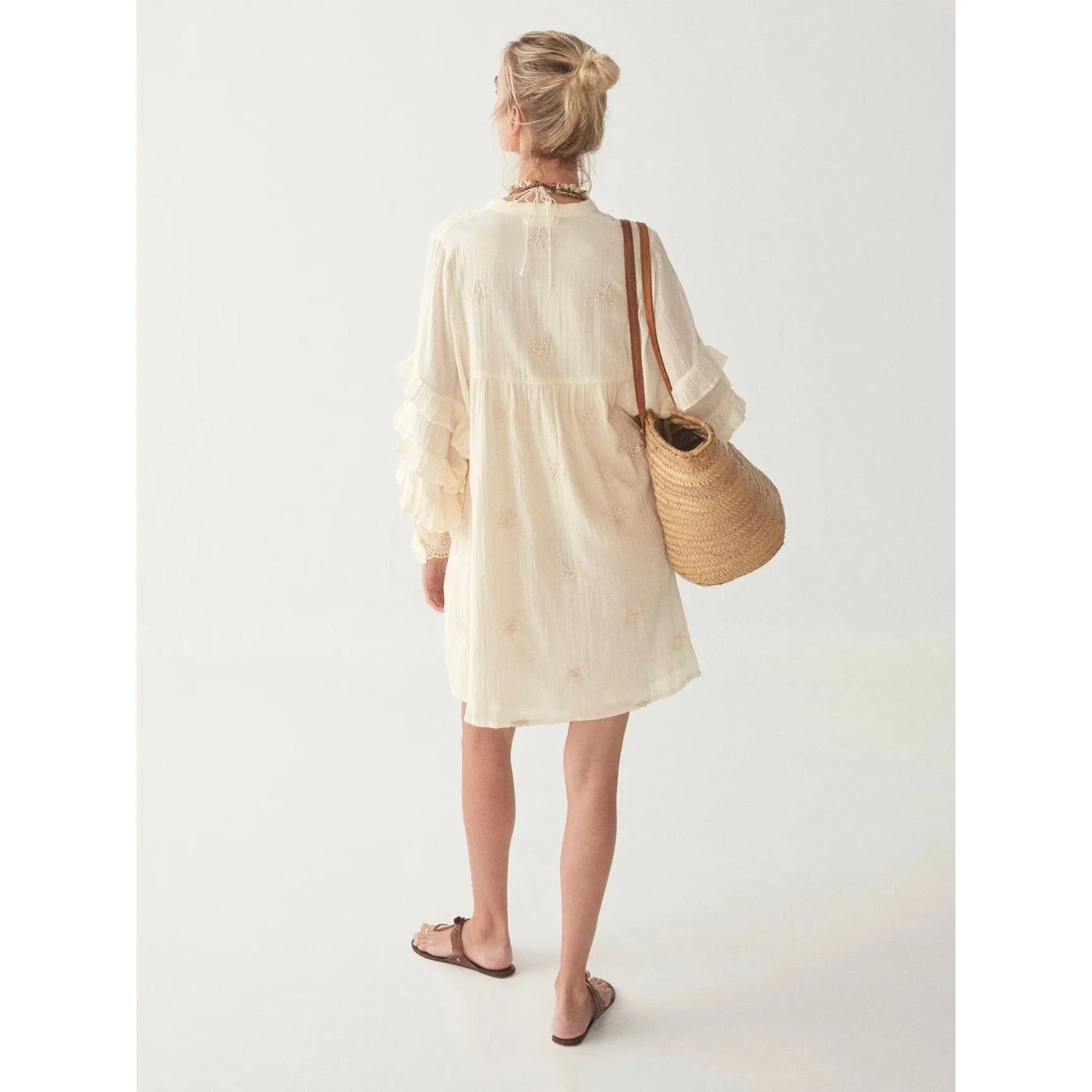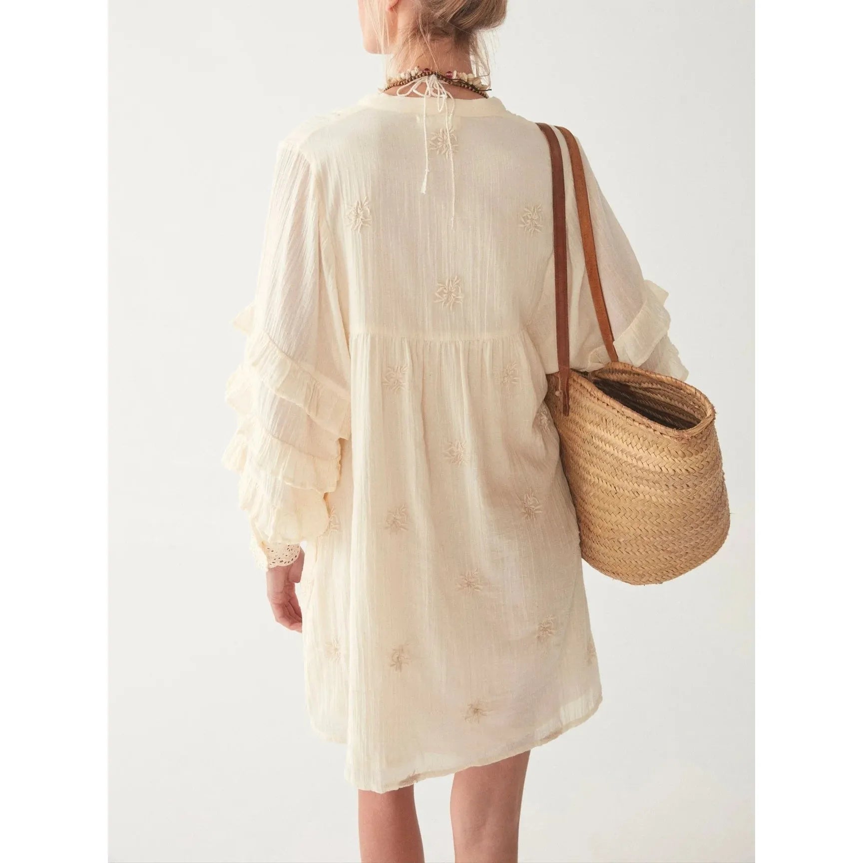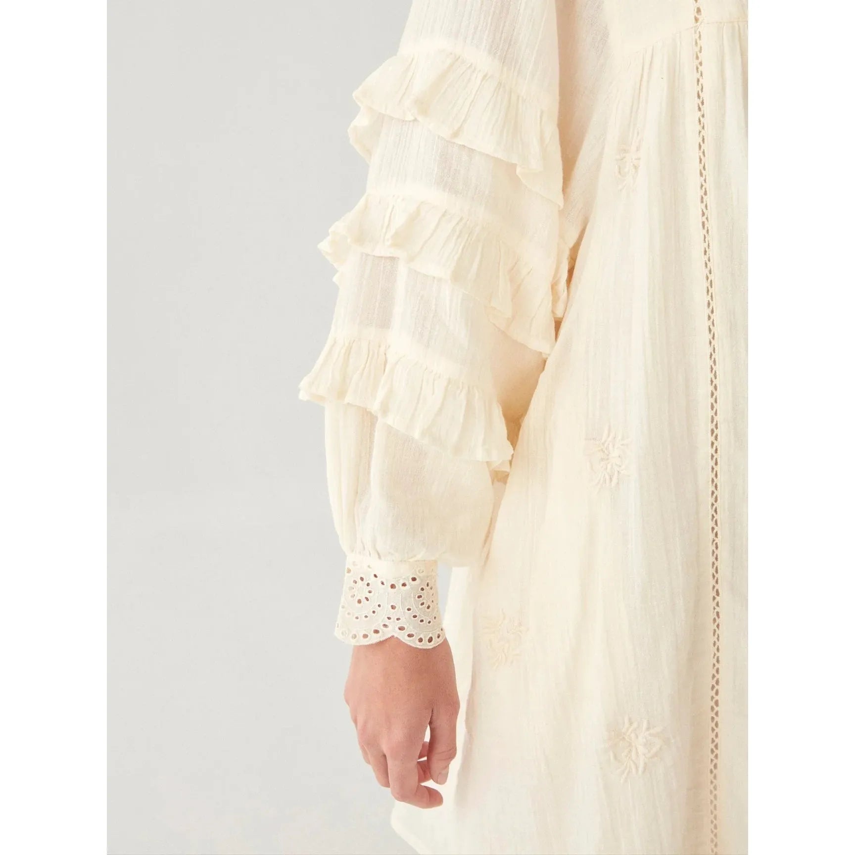 The short dress features an all-around, on-tone flower embroidery, thin delicate laces running across the sides, multi-ruffle sleeves and a schiffle cuff.