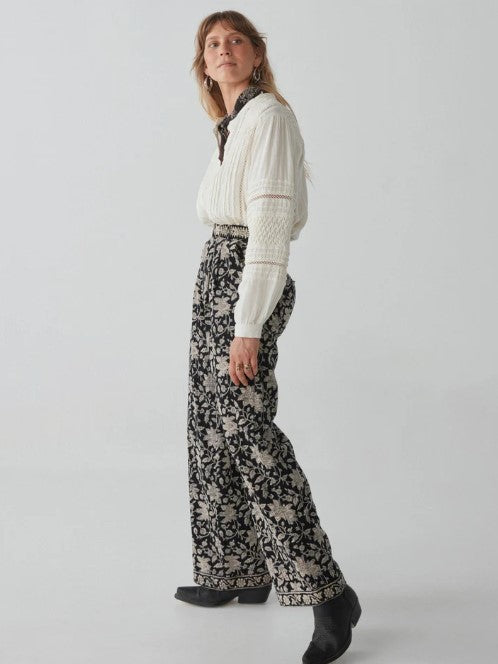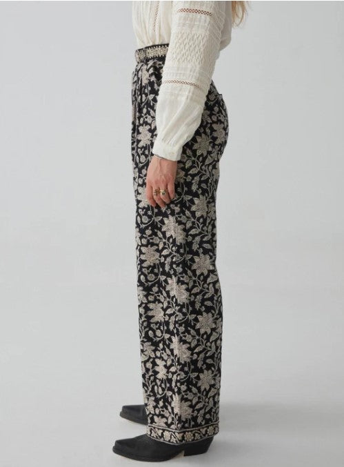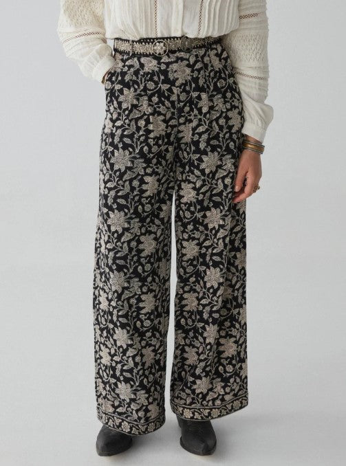 The high-waisted cut flatters the silhouette, cinching at the waist before flowing into a wide, relaxed leg that moves with effortless grace. The fit is tailored yet comfortable. At the hem, the floral pattern is framed by a subtle border, adding a finishing touch of refinement that speaks to the craftsmanship of the piece.