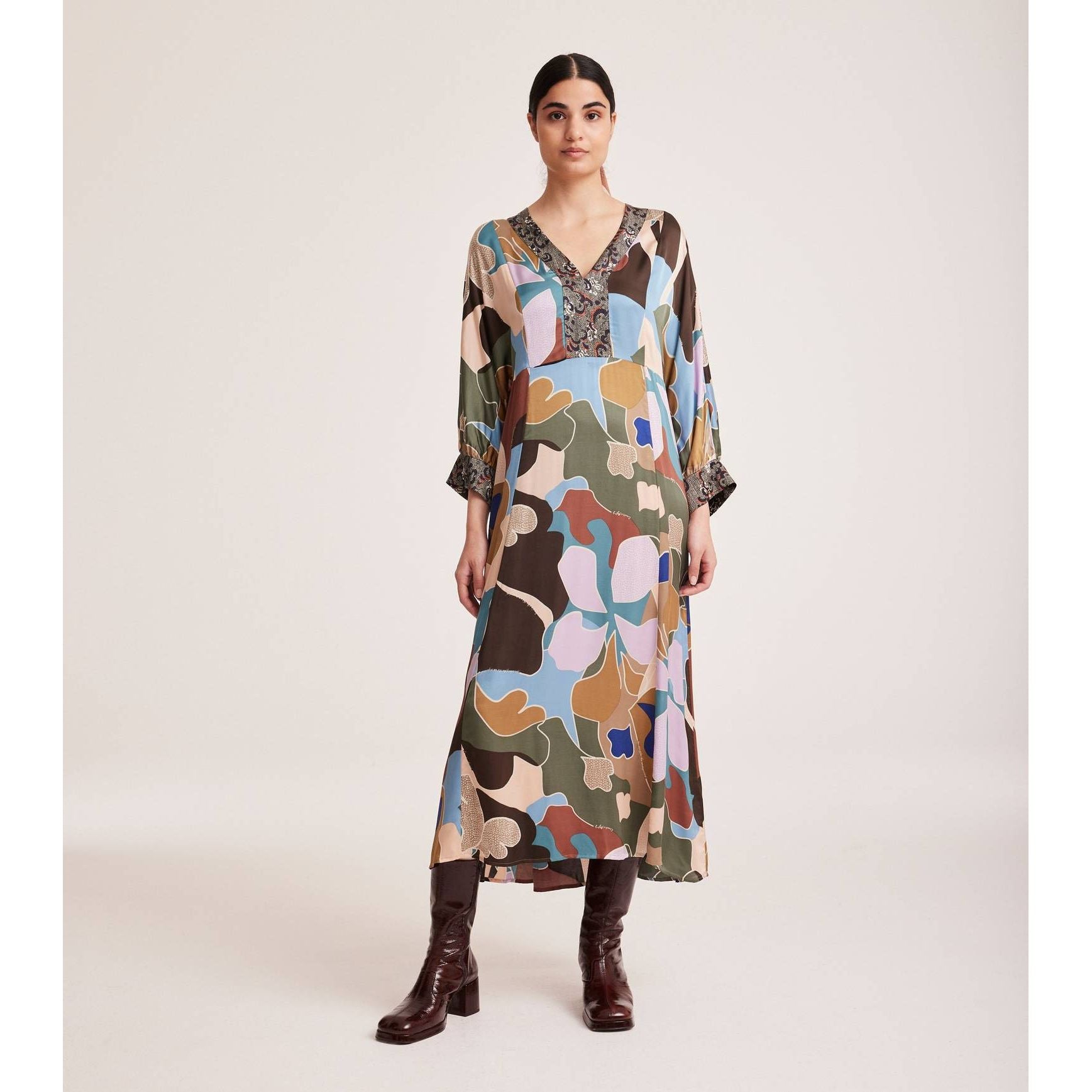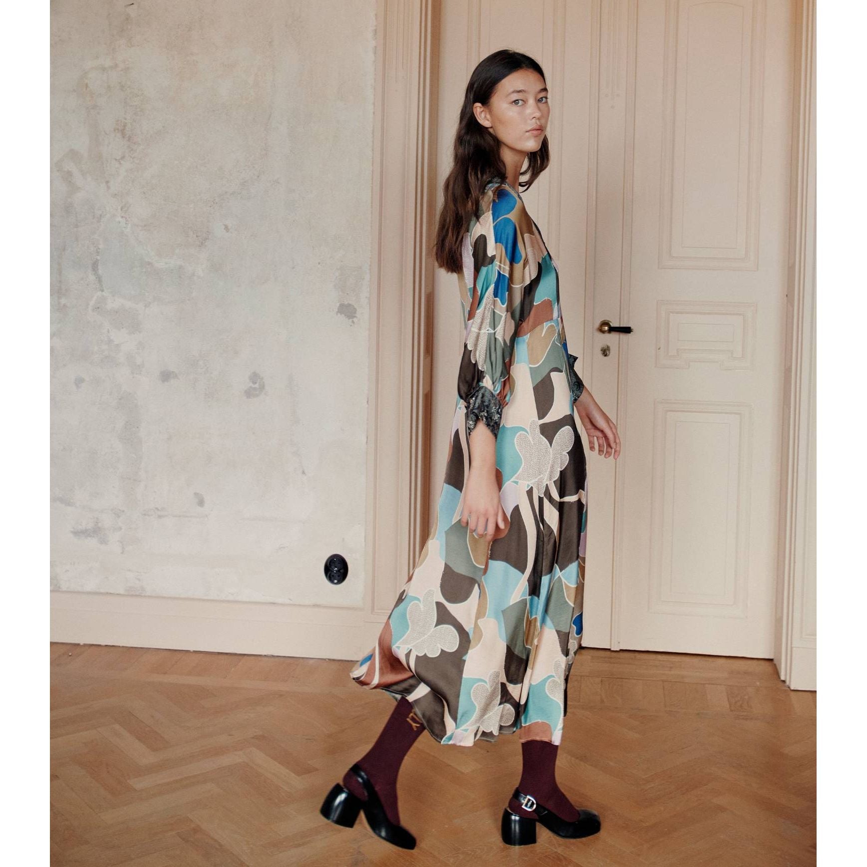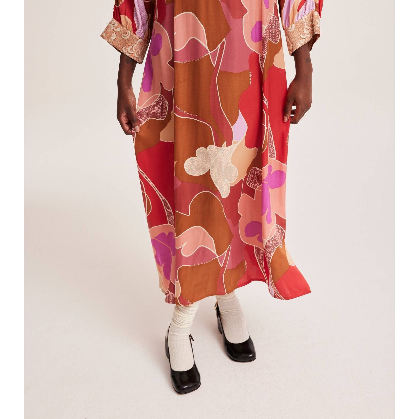 The Odd Molly Amalia Dress is a long, flowy viscose maxi dress with a colorful block print. The print art is made by our in-house print designer. She's embedded small, dreamy quotes in the art, for example: "Heading for the unexpected" and "Creative flying".