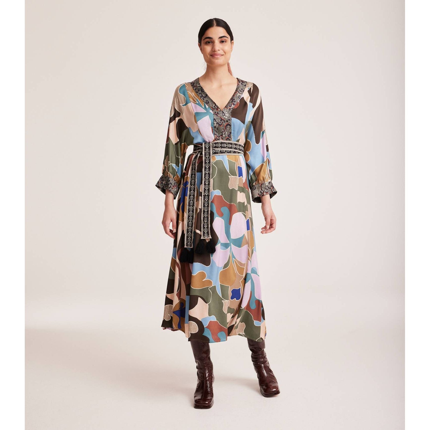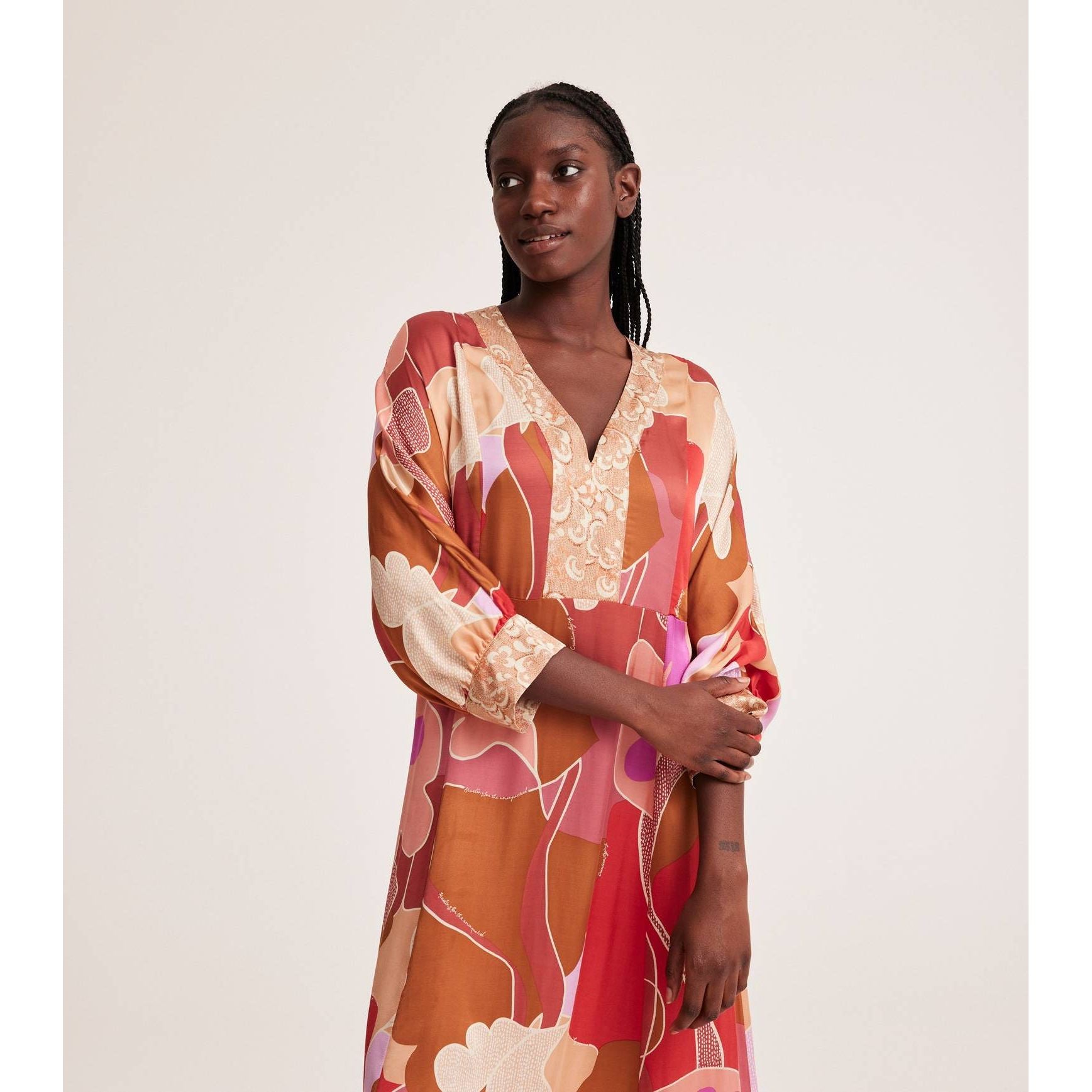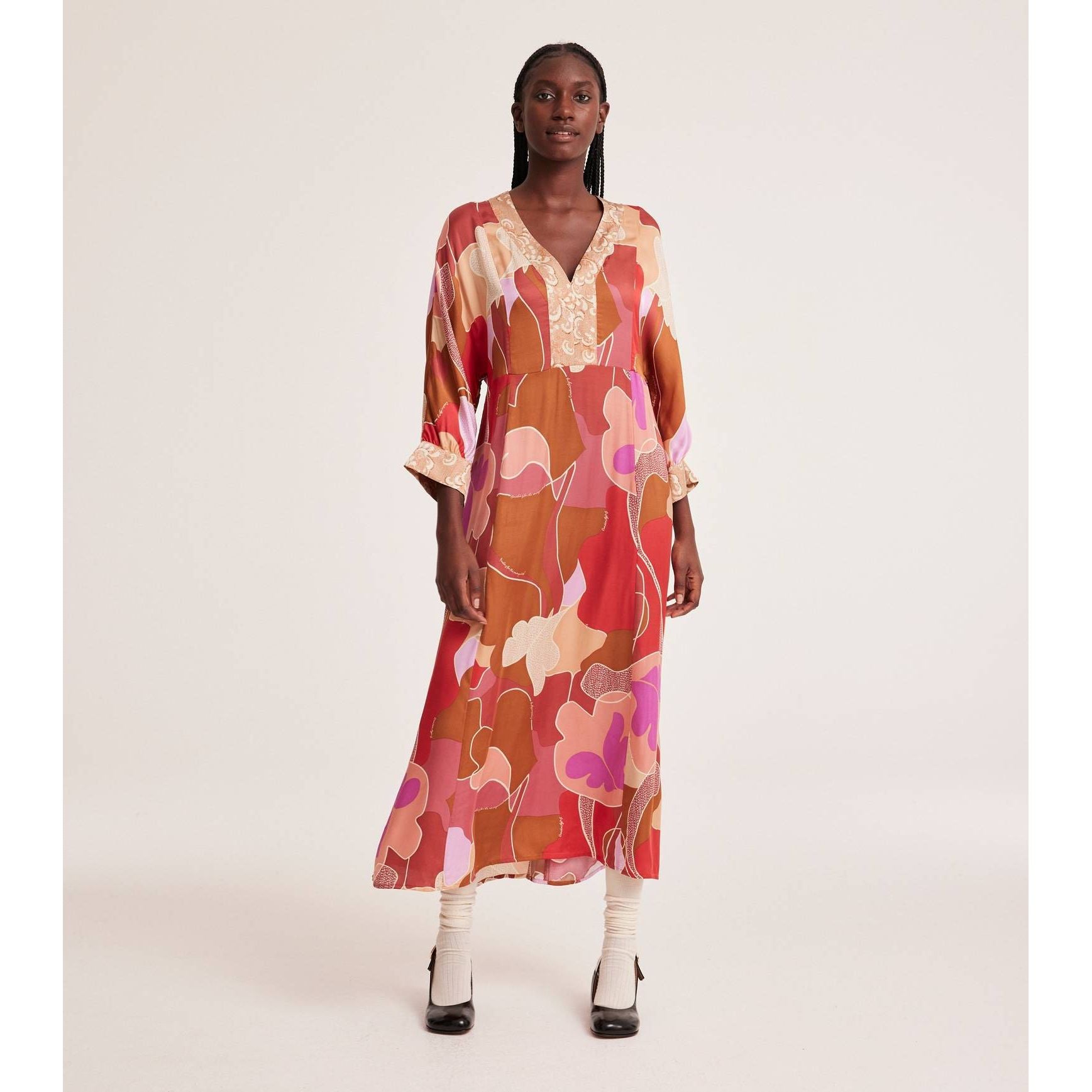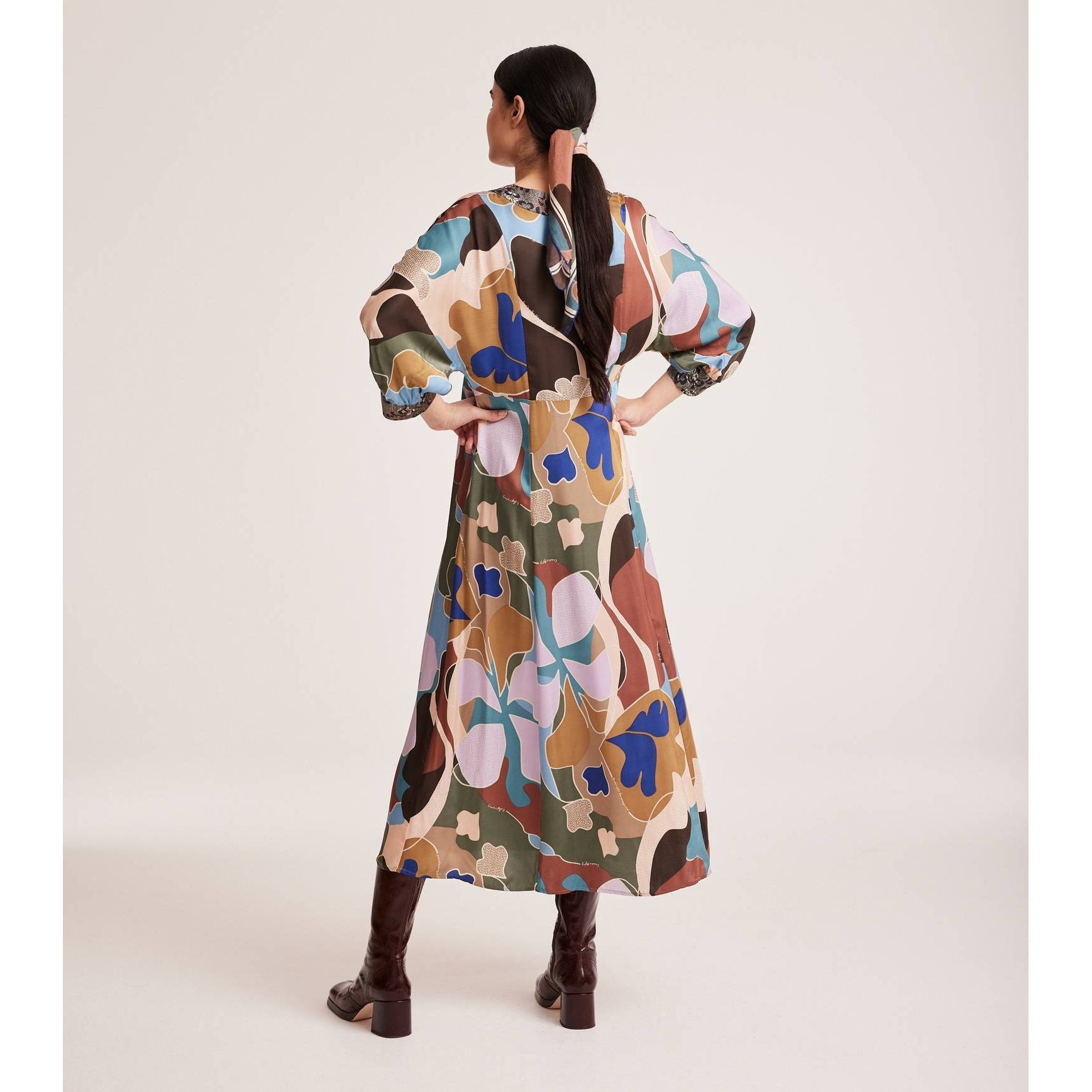 The Odd Molly Amalia Dress is a long, flowy viscose maxi dress with a colorful block print. The print art is made by our in-house print designer. She's embedded small, dreamy quotes in the art, for example: "Heading for the unexpected" and "Creative flying".