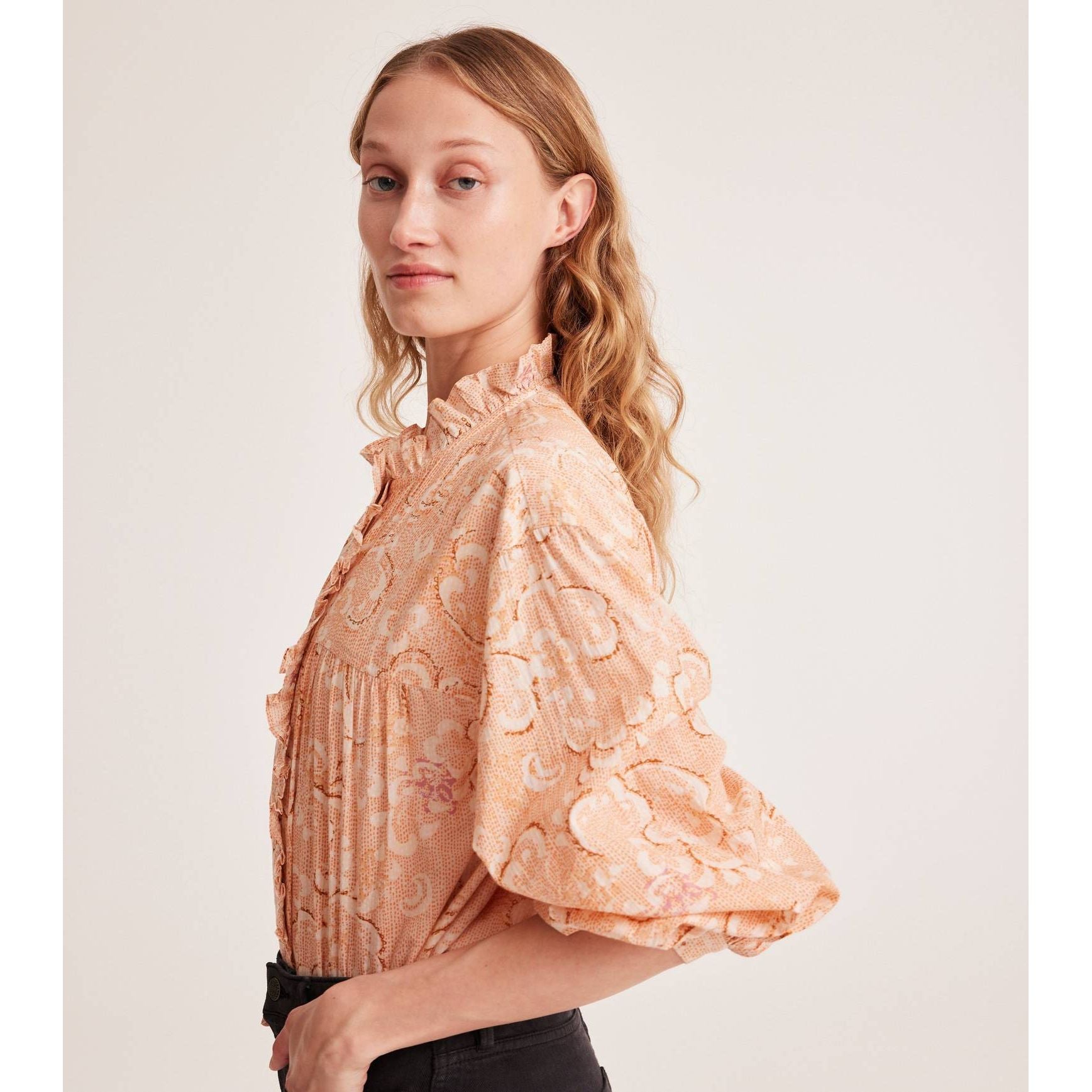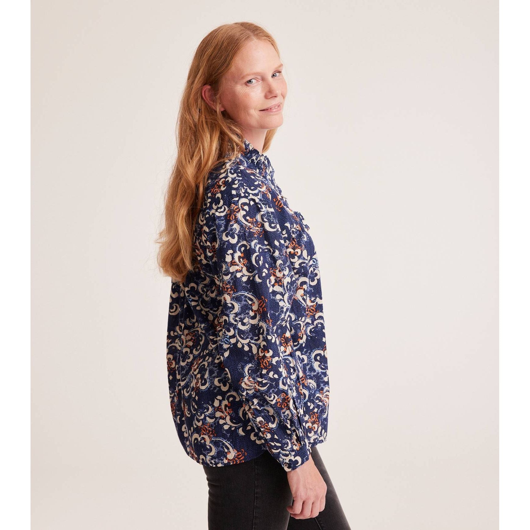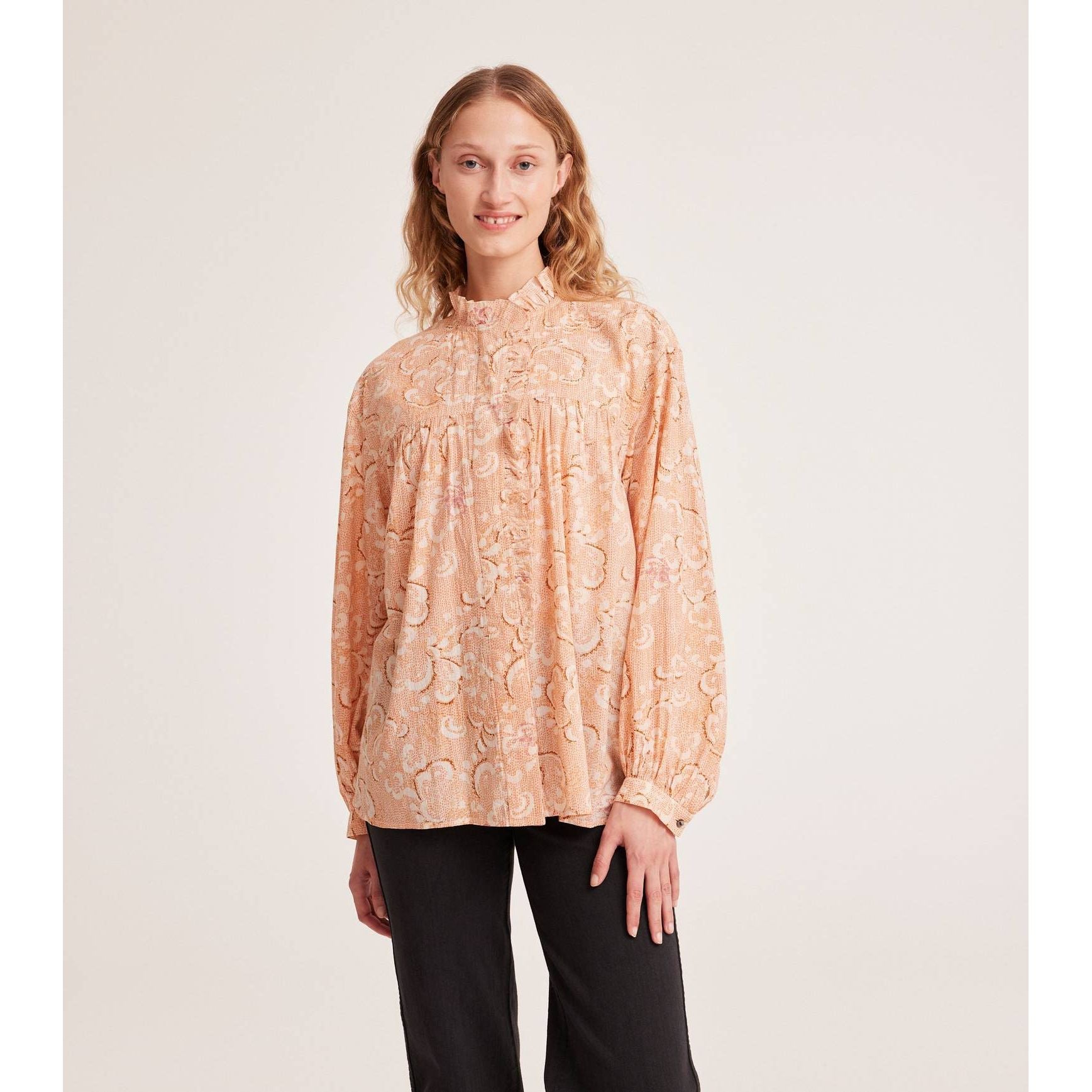The Odd Molly Arienne Blouse is an organic cotton blouse with an allover print made by our in-house print designer. It has long sleeves with cuffs and mother of pearl buttons for closure. It has a high neck, frill details and gathers at the front and on the sleeves.