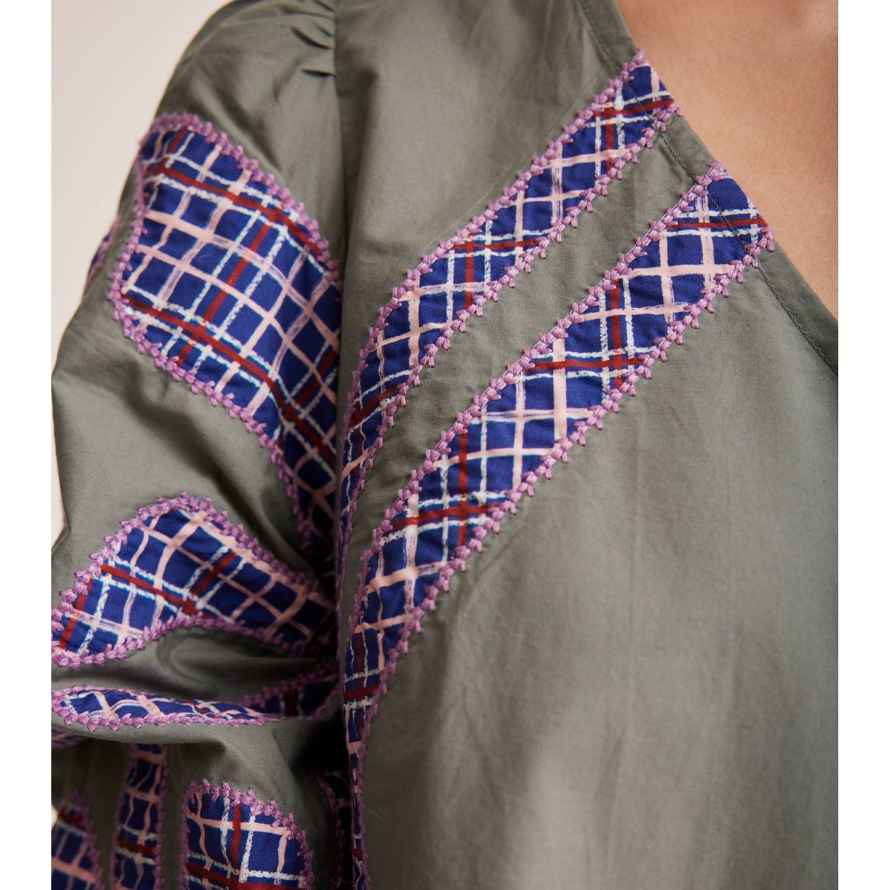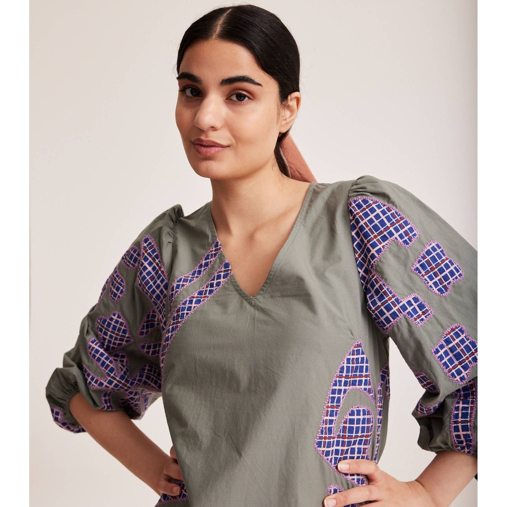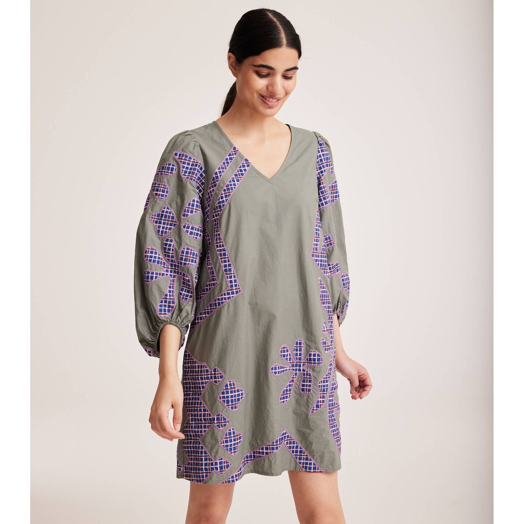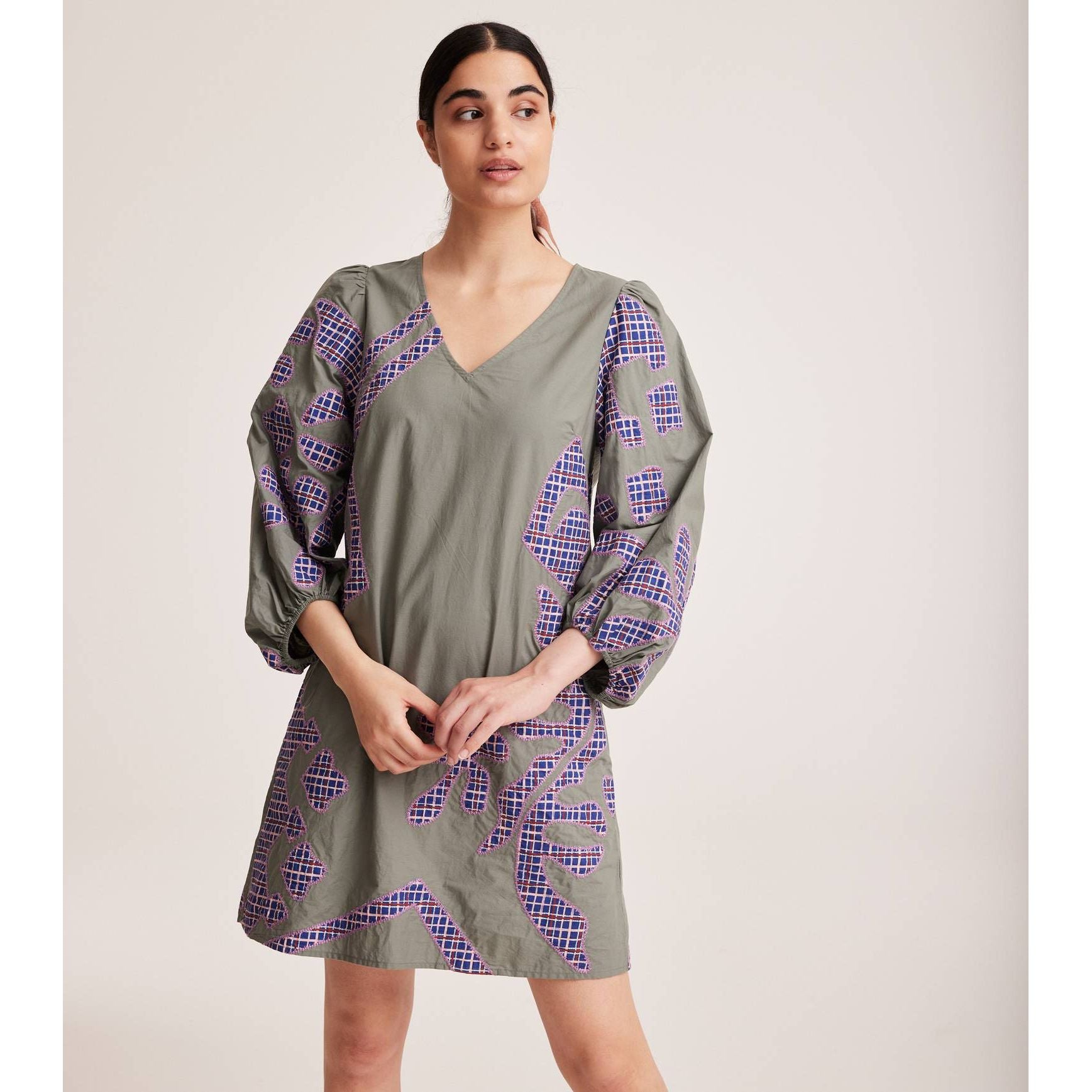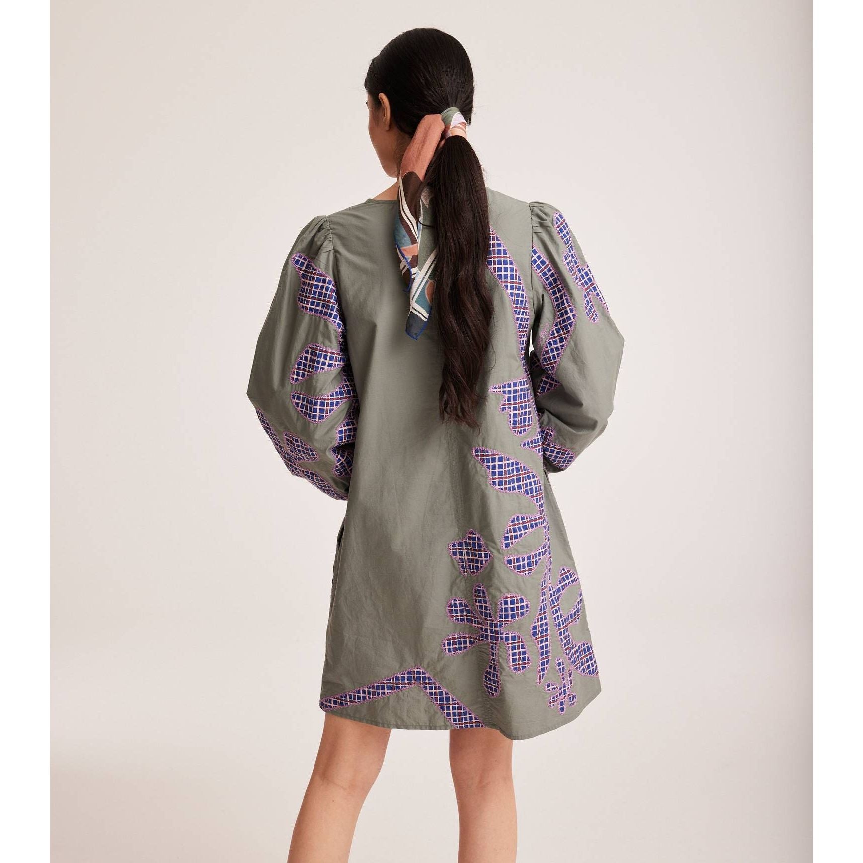 The Odd Molly Brittany Dress is an organic cotton short dress with embroidery details. It has a regular fit and 3/4 puff sleeves. The embroidery artwork is made by our in-house print designer.