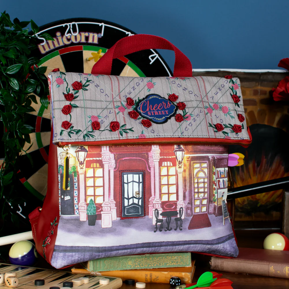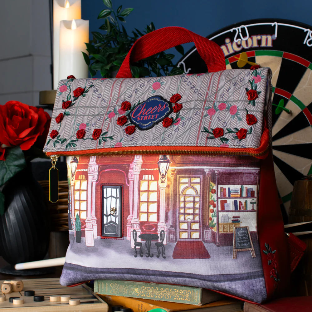 Enjoy a carefree, hands-free autumn with the Cheers Street Clara Backpack. This soft vegan leather bag offers ample space for your daily essentials, whether for school, work, or weekend outings. It comes with a top handle and multiway adjustable straps so you can wear it as a backpack or a shoulder bag. The vibrant, hand-drawn Cheers Street artwork is rich with colour, stitched roses, and charming pub-fronts, all set against a moonlit backdrop. With the Vendula-printed lining and detailed signage, this bag is the statement piece of the season. Ready to toast your style?