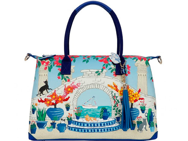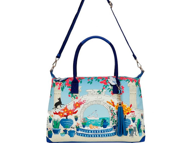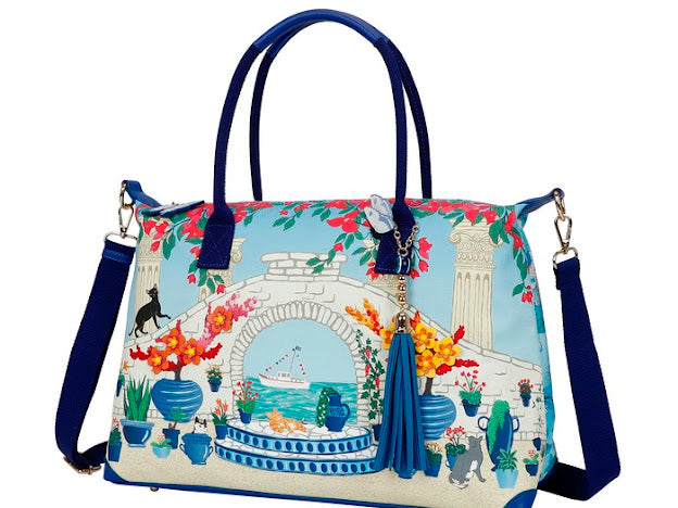 “Yassas” and welcome to Greece! The Gardens of the World Greece Bonnie Weekender is the epitome of style. With two comfortable handles and a detachable strap, it ensures you can carry it comfortably at all times. Its roomy compartment and multiple pockets will hold everything you need for work, school, or a summer getaway. If you’ve always dreamed of visiting the Hellenic Republic, this vegan leather bag will inspire you to book your next holiday. The sun shines brightly over the Aegean Sea, and you’ll find yourself admiring this breathtaking view (and those adorable cats!) until autumn comes around. Another country checked off your list, thanks to us!