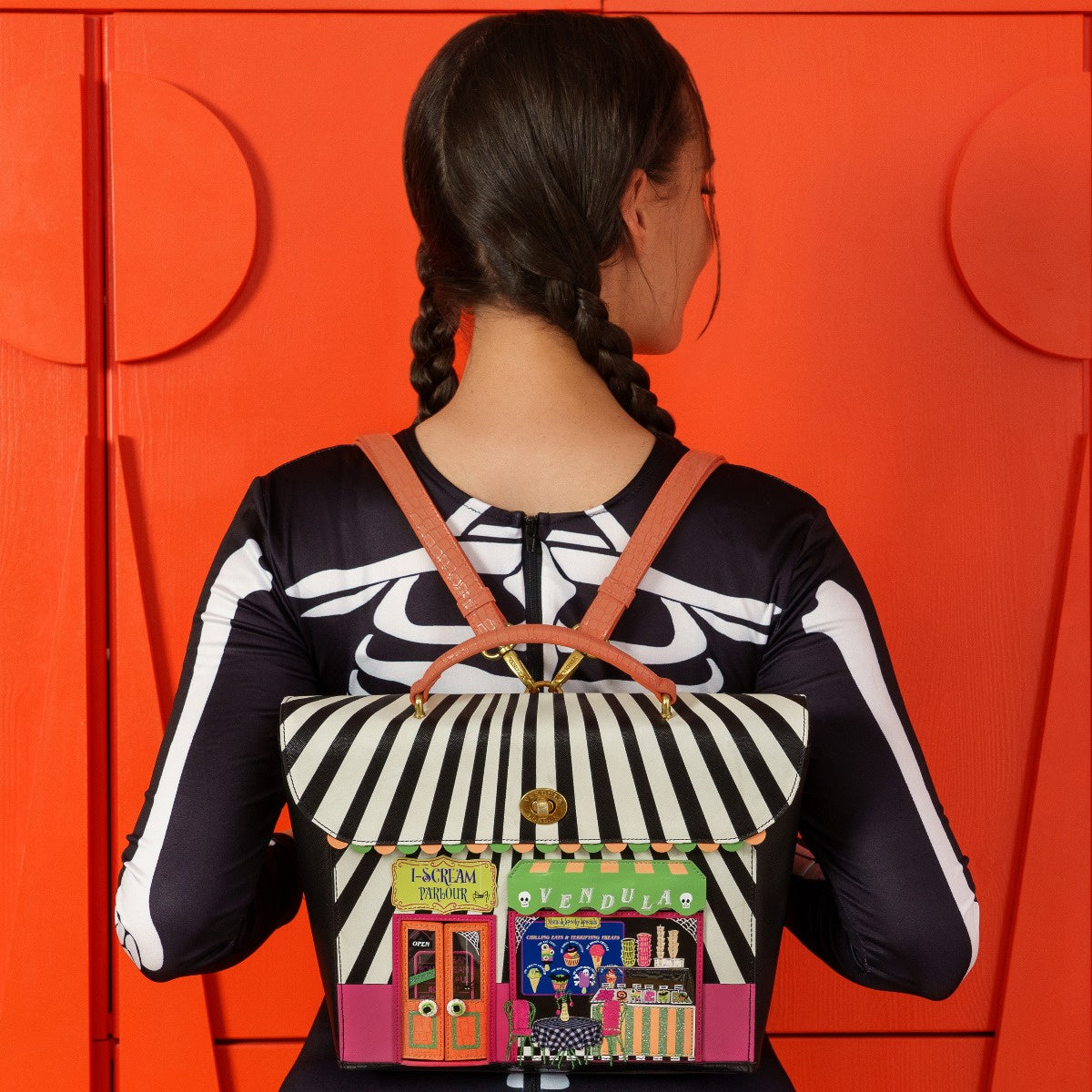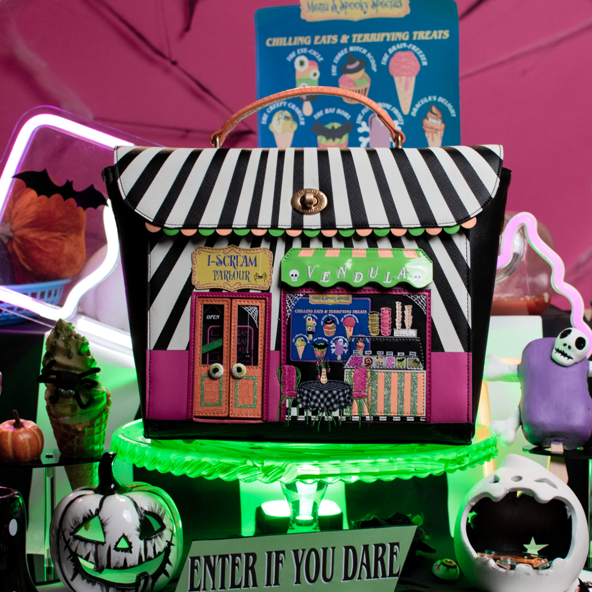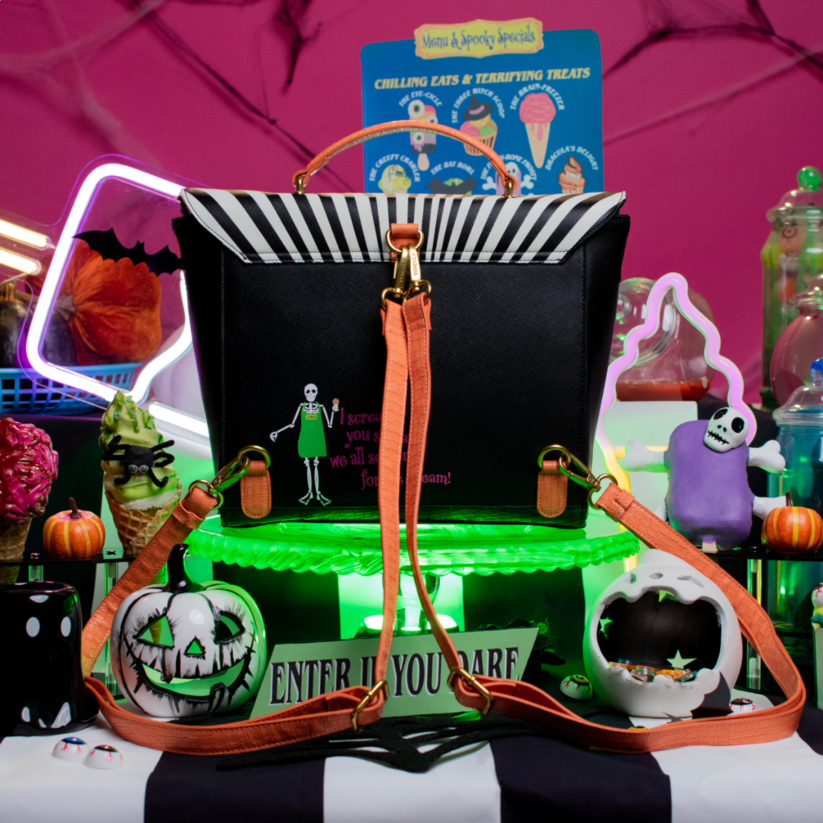 ’Enter if you dare’’? That bodes well, doesn’t it? Made of vegan leather, the I-Scream Parlour Backpack sports a spacious main compartment to fit in all you need daily, and pockets to keep you organised. It comes with two detachable straps that allow you to use the bag either like a backpack, a shoulder/crossbody bag, or like a classic handbag, by simply clipping them on or off. Doesn’t it look deadly – to say the least – with glow in the dark elements, skulls, cobwebs and a display of ice creams, each one spookier than the last? We wouldn’t mind trying the ‘’Funny Bones’’ or ‘’Funny-Bone Frosty’’ ice creams. They’re said to tingle all the way down to your stomach… muhahahaha!
