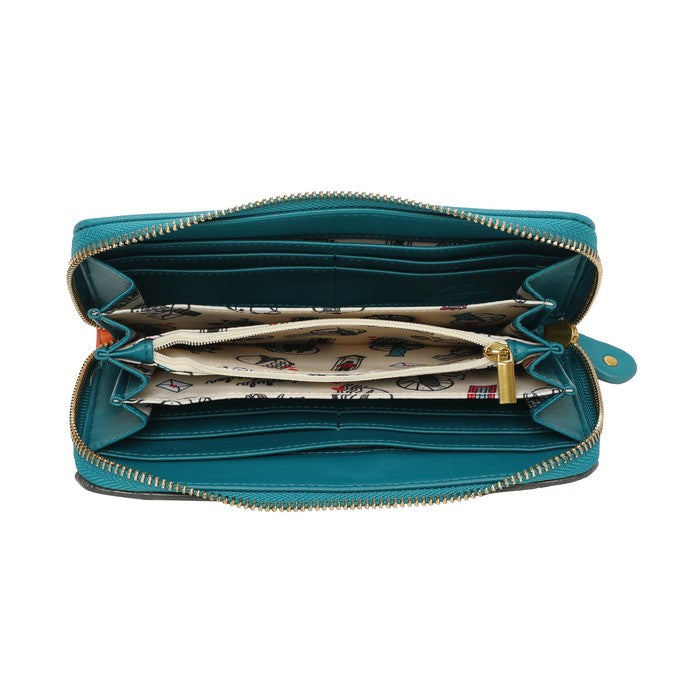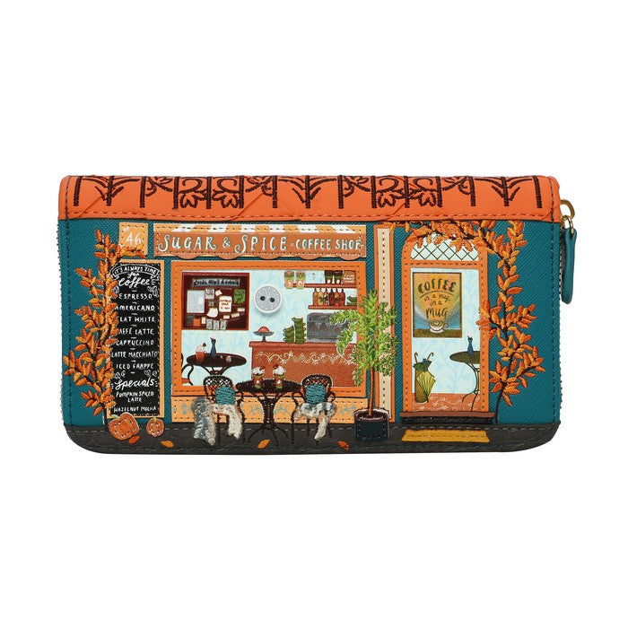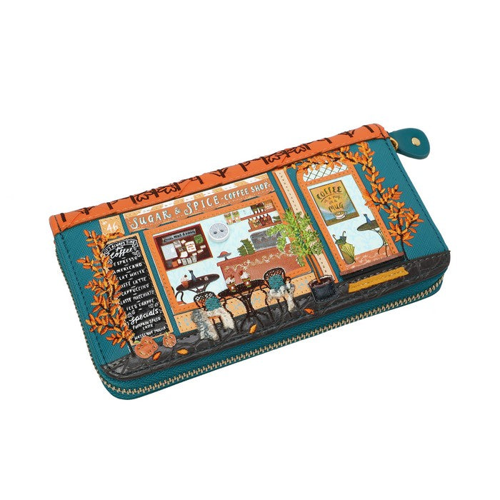Coffee and pastry go hand in hand, and so do our bags and wallets! The Sugar and Spice Coffee Shop Large Ziparound Wallet can fit in most bags. It has plenty of room for cash, with a dedicated zipped pocket for coins, emplacements for notes and receipts, and a few card slots. Made of vegan leather, this Vendula wallet sports a similar artwork as the bags, with printed and 3D details. You will cause a stir at your local coffee shop with this new accessory and its matching bag. Draw out the pleasure by taking a few extra seconds to place your order, so the barista can admire your wallet a little longer!
