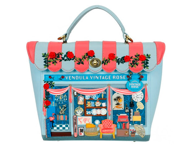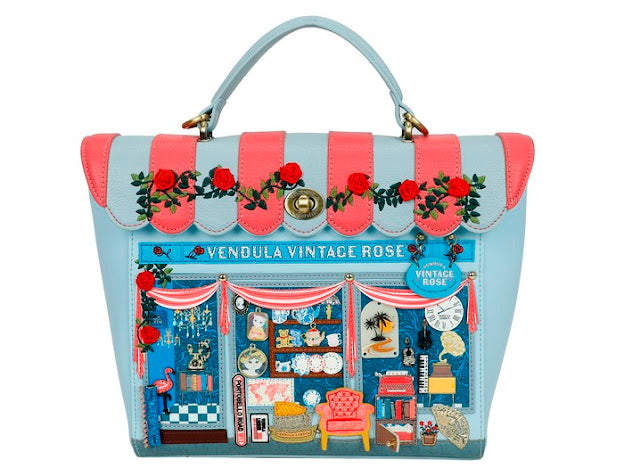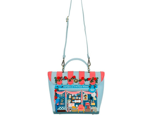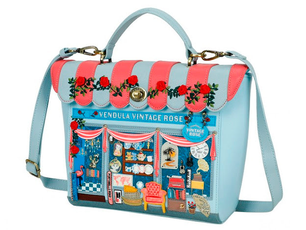 We’re bringing back an iconic bag shape! Get ready for the Vendula Vintage Rose Classic Backpack. This vegan leather accessory holds all your essentials in a spacious main compartment, with a secure flap clasp closure to keep everything safe. It has a comfortable handle and two detachable straps, so you can carry it as a handbag, over the shoulder, or crossbody. This blue backpack features charming artwork, including hand-stitched roses on the awning and a shopfront full of vintage treasures. Step inside and explore—you may find something you didn’t know you needed!