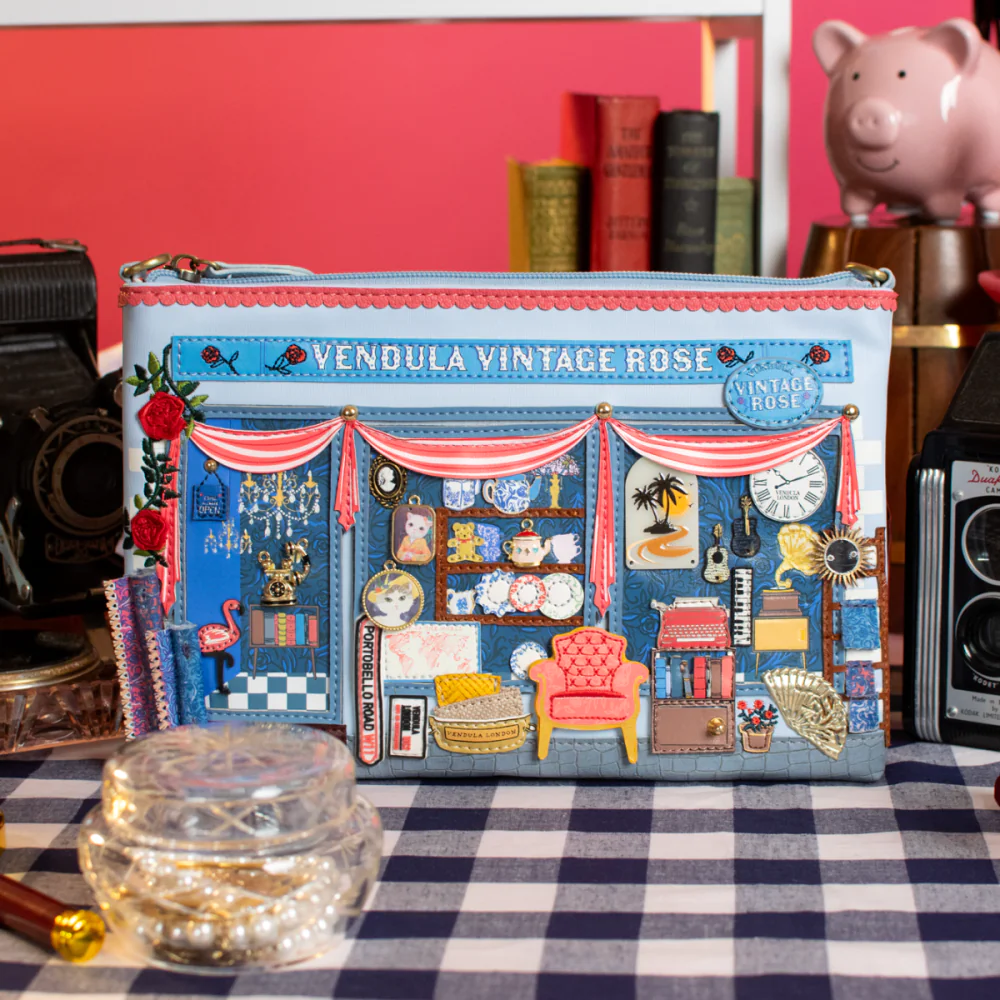 The perfect bag does exist—it’s the Vendula Vintage Rose Kate Bag! This vegan leather accessory comes with a detachable strap, transforming it from a pouch to a shoulder or crossbody bag. It features a spacious compartment and multiple pockets to keep your essentials organized. The stunning blue colour and vintage shopfront artwork, complete with colourful objects, make it a standout. Pair it with a Vendula Vintage Rose wallet or coin purse to complete the look!